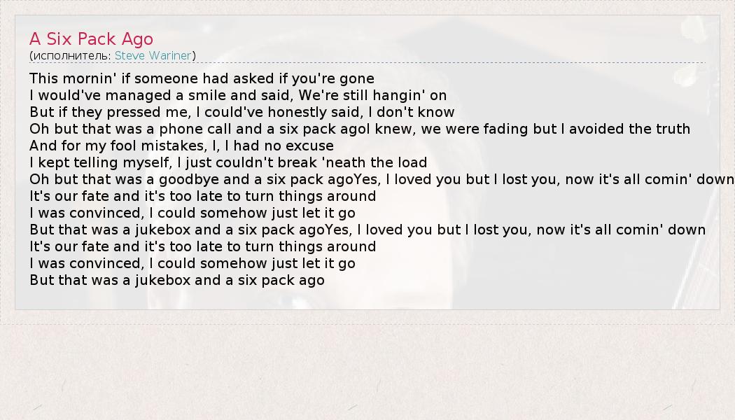 This mornin' if someone had asked if you're gone I would've managed a smile and said, We're still hangin' on But if they pressed me, I could've honestly said, I don't know Oh but that was a phone call and a six pack agoI knew, we were fading but I avoided the truth And for my fool mistakes, I, I had no excuse I kept telling myself, I just couldn't break 'neath the load Oh but that was a goodbye and a six pack agoYes, I loved you but I lost you, now it's all comin' down It's our fate and it's too late to turn things around I was convinced, I could somehow just let it go But that was a jukebox and a six pack agoYes, I loved you but I lost you, now it's all comin' down It's our fate and it's too late to turn things around I was convinced, I could somehow just let it go But that was a jukebox and a six pack ago