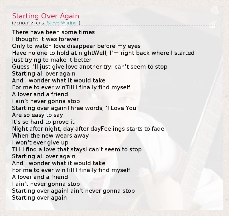 There have been some times I thought it was forever Only to watch love disappear before my eyes Have no one to hold at nightWell, I'm right back where I started Just trying to make it better Guess I'll just give love another tryI can't seem to stop Starting all over again And I wonder what it would take For me to ever winTill I finally find myself A lover and a friend I ain't never gonna stop Starting over againThree words, 'I Love You' Are so easy to say It's so hard to prove it Night after night, day after dayFeelings starts to fade When the new wears away I won't ever give up Till I find a love that staysI can't seem to stop Starting all over again And I wonder what it would take For me to ever winTill I finally find myself A lover and a friend I ain't never gonna stop Starting over againI ain't never gonna stop Starting over again