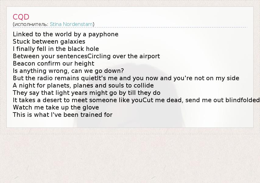 Linked to the world by a payphone Stuck between galaxies I finally fell in the black hole Between your sentencesCircling over the airport Beacon confirm our height Is anything wrong, can we go down? But the radio remains quietIt's me and you now and you're not on my side A night for planets, planes and souls to collide They say that light years might go by till they do It takes a desert to meet someone like youCut me dead, send me out blindfolded Watch me take up the glove This is what I've been trained for