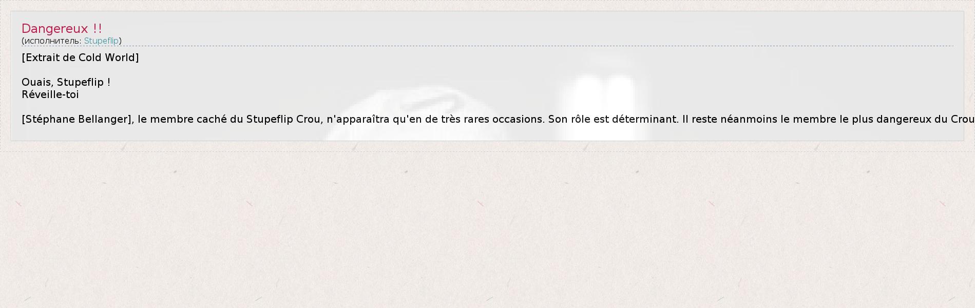 [Stéphane Bellanger], le membre caché du Stupeflip Crou, n'apparaîtra qu'en de très rares occasions. Son rôle est déterminant. Il reste néanmoins le membre le plus dangereux du Crou