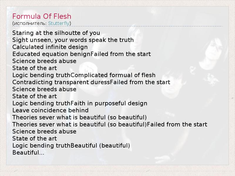 А как ты думаешь, о чем песня "Formula Of Flesh" ?