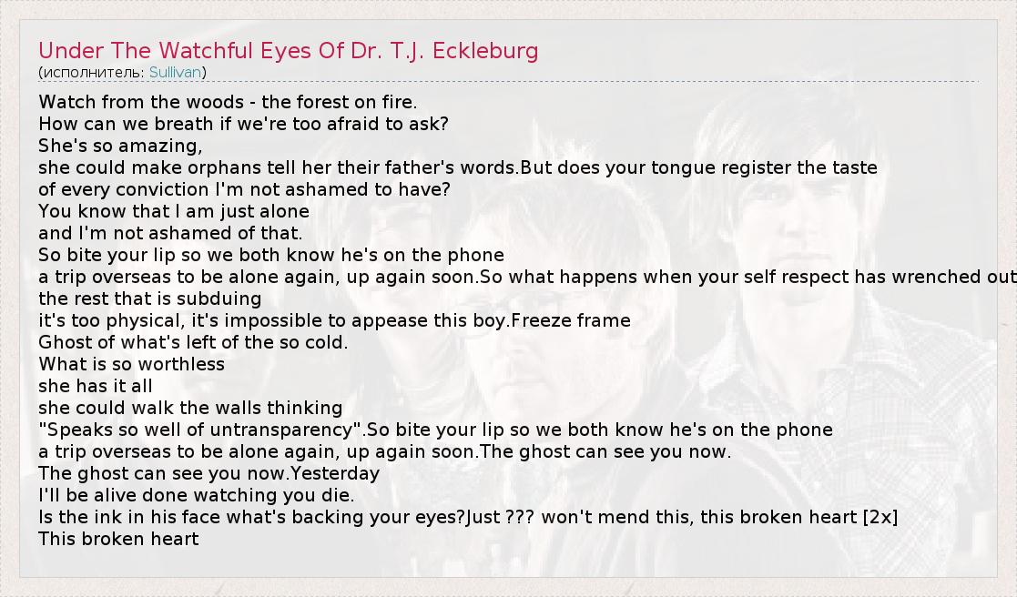 А как ты думаешь, о чем песня "Under The Watchful Eyes Of Dr. T.J. Eckleburg" ?