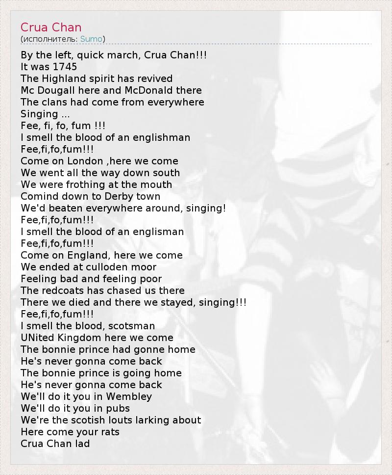 By the left, quick march, Crua Chan!!! It was 1745 The Highland spirit has revived Mc Dougall here and McDonald there The clans had come from everywhere Singing ... Fee, fi, fo, fum !!! I smell the blood of an englishman Fee,fi,fo,fum!!! Come on London ,here we come We went all the way down south We were frothing at the mouth Comind down to Derby town We'd beaten everywhere around, singing! Fee,fi,fo,fum!!! I smell the blood of an englisman Fee,fi,fo,fum!!! Come on England, here we come We ended at culloden moor Feeling bad and feeling poor The redcoats has chased us there There we died and there we stayed, singing!!! Fee,fi,fo,fum!!! I smell the blood, scotsman UNited Kingdom here we come The bonnie prince had gonne home He's never gonna come back The bonnie prince is going home He's never gonna come back We'll do it you in Wembley We'll do it you in pubs We're the scotish louts larking about Here come your rats Crua Chan lad