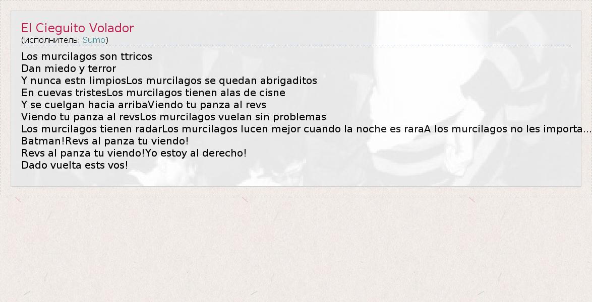 Los murcilagos son ttricos Dan miedo y terror Y nunca estn limpiosLos murcilagos se quedan abrigaditos En cuevas tristesLos murcilagos tienen alas de cisne Y se cuelgan hacia arribaViendo tu panza al revs Viendo tu panza al revsLos murcilagos vuelan sin problemas Los murcilagos tienen radarLos murcilagos lucen mejor cuando la noche es raraA los murcilagos no les importa... Batman!Revs al panza tu viendo! Revs al panza tu viendo!Yo estoy al derecho! Dado vuelta ests vos!