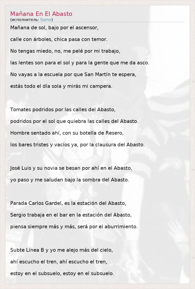 Mañana de sol, bajo por el ascensor, calle con árboles, chica pasa con temor. No tengas miedo, no, me pelé por mi trabajo, las lentes son para el sol y para la gente que me da asco. No vayas a la escuela por que San Martín te espera, estás todo el día sola y mirás mi campera. Tomates podridos por las calles del Abasto, podridos por el sol que quiebra las calles del Abasto. Hombre sentado ahí, con su botella de Resero, los bares tristes y vacíos ya, por la clausura del Abasto. José Luis y su novia se besan por ahí en el Abasto, yo paso y me saludan bajo la sombra del Abasto. Parada Carlos Gardel, es la estación del Abasto, Sergio trabaja en el bar en la estación del Abasto, piensa siempre más y más, será por el aburrimiento. Subte Línea B y yo me alejo más del cielo, ahí escucho el tren, ahí escucho el tren, estoy en el subsuelo, estoy en el subsuelo.