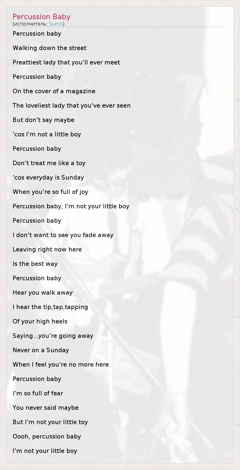 Percussion baby Walking down the street Preattiest lady that you'll ever meet Percussion baby On the cover of a magazine The loveliest lady that you've ever seen But don't say maybe 'cos I'm not a little boy Percussion baby Don't treat me like a toy 'cos everyday is Sunday When you're so full of joy Percussion baby, I'm not your little boy Percussion baby I don't want to see you fade away Leaving right now here Is the best way Percussion baby Hear you walk away I hear the tip,tap,tapping Of your high heels Saying...you're going away Never on a Sunday When I feel you're no more here Percussion baby I'm so full of fear You never said maybe But I'm not your little toy Oooh, percussion baby I'm not your little boy