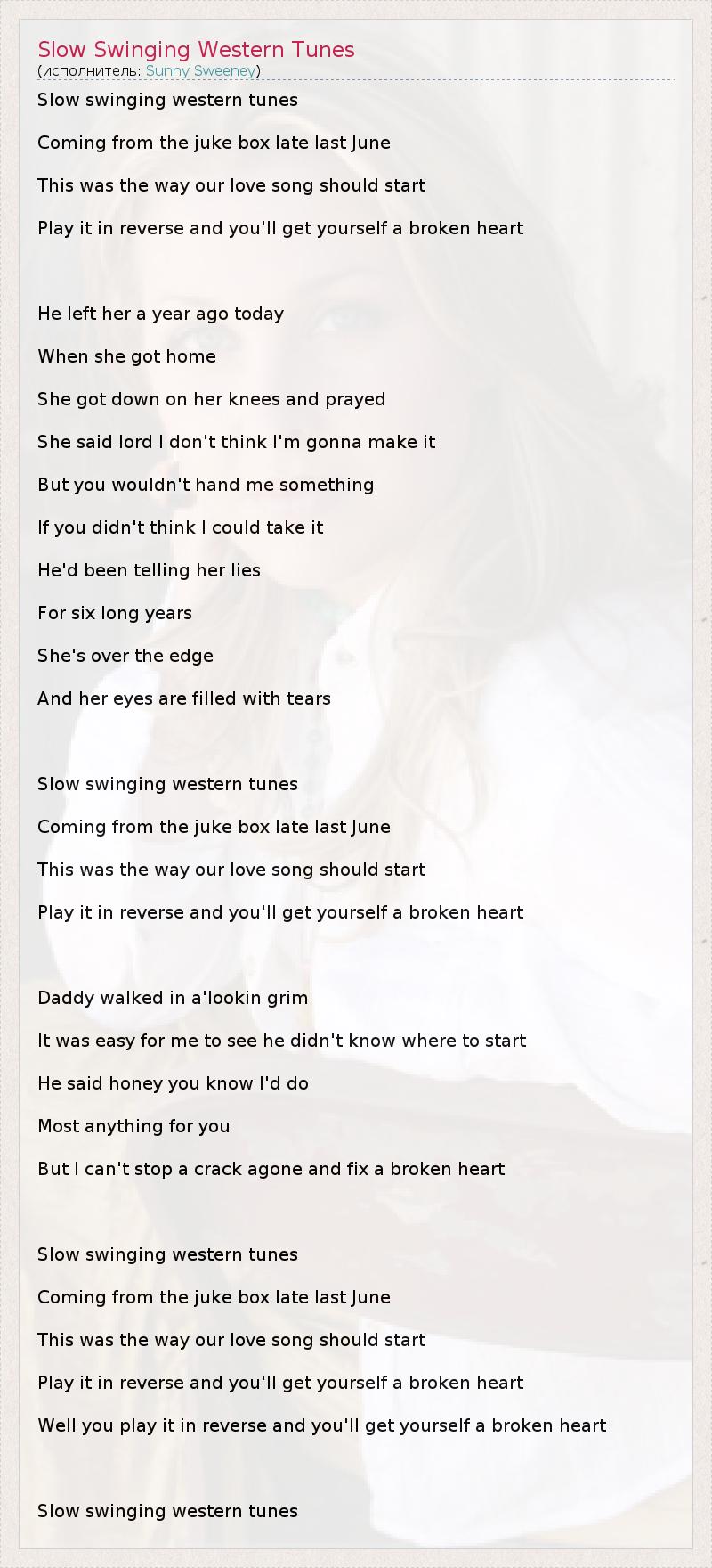 Slow swinging western tunes Coming from the juke box late last June This was the way our love song should start Play it in reverse and you'll get yourself a broken heart He left her a year ago today When she got home She got down on her knees and prayed She said lord I don't think I'm gonna make it But you wouldn't hand me something If you didn't think I could take it He'd been telling her lies For six long years She's over the edge And her eyes are filled with tears Slow swinging western tunes Coming from the juke box late last June This was the way our love song should start Play it in reverse and you'll get yourself a broken heart Daddy walked in a'lookin grim It was easy for me to see he didn't know where to start He said honey you know I'd do Most anything for you But I can't stop a crack agone and fix a broken heart Slow swinging western tunes Coming from the juke box late last June This was the way our love song should start Play it in reverse and you'll get yourself a broken heart Well you play it in reverse and you'll get yourself a broken heart Slow swinging western tunes