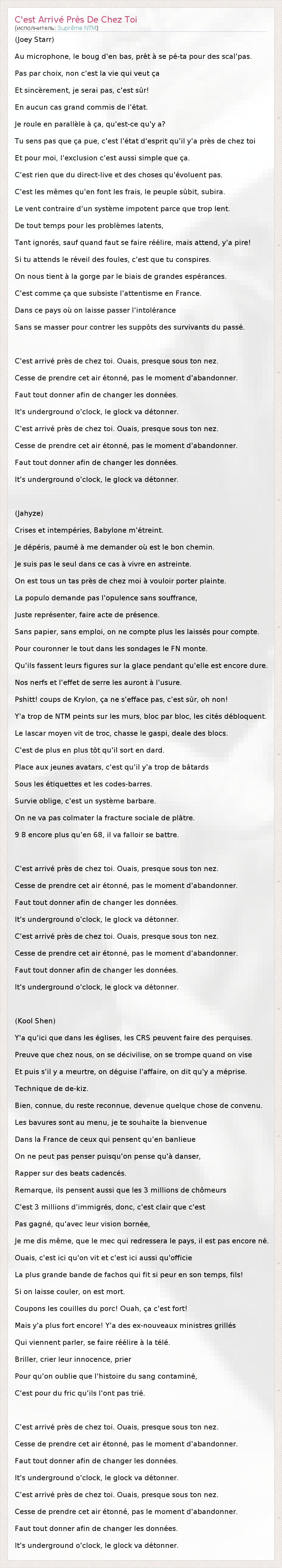 (Joey Starr) Au microphone, le boug d'en bas, prêt à se pé-ta pour des scal'pas. Pas par choix, non c'est la vie qui veut ça Et sincèrement, je serai pas, c'est sûr! En aucun cas grand commis de l'état. Je roule en parallèle à ça, qu'est-ce qu'y a? Tu sens pas que ça pue, c'est l'état d'esprit qu'il y'a près de chez toi Et pour moi, l'exclusion c'est aussi simple que ça. C'est rien que du direct-live et des choses qu'évoluent pas. C'est les mêmes qu'en font les frais, le peuple sûbit, subira. Le vent contraire d'un système impotent parce que trop lent. De tout temps pour les problèmes latents, Tant ignorés, sauf quand faut se faire réélire, mais attend, y'a pire! Si tu attends le réveil des foules, c'est que tu conspires. On nous tient à la gorge par le biais de grandes espérances. C'est comme ça que subsiste l'attentisme en France. Dans ce pays où on laisse passer l'intolérance Sans se masser pour contrer les suppôts des survivants du passé. C'est arrivé près de chez toi. Ouais, presque sous ton nez. Cesse de prendre cet air étonné, pas le moment d'abandonner. Faut tout donner afin de changer les données. It's underground o'clock, le glock va détonner. C'est arrivé près de chez toi. Ouais, presque sous ton nez. Cesse de prendre cet air étonné, pas le moment d'abandonner. Faut tout donner afin de changer les données. It's underground o'clock, le glock va détonner. (Jahyze) Crises et intempéries, Babylone m'étreint. Je dépéris, paumé à me demander où est le bon chemin. Je suis pas le seul dans ce cas à vivre en astreinte. On est tous un tas près de chez moi à vouloir porter plainte. La populo demande pas l'opulence sans souffrance, Juste représenter, faire acte de présence. Sans papier, sans emploi, on ne compte plus les laissés pour compte. Pour couronner le tout dans les sondages le FN monte. Qu'ils fassent leurs figures sur la glace pendant qu'elle est encore dure. Nos nerfs et l'effet de serre les auront à l'usure. Pshitt! coups de Krylon, ça ne s'efface pas, c'est sûr, oh non! Y'a trop de NTM peints sur les murs, bloc par bloc, les cités débloquent. Le lascar moyen vit de troc, chasse le gaspi, deale des blocs. C'est de plus en plus tôt qu'il sort en dard. Place aux jeunes avatars, c'est qu'il y'a trop de bâtards Sous les étiquettes et les codes-barres. Survie oblige, c'est un système barbare. On ne va pas colmater la fracture sociale de plâtre. 9 8 encore plus qu'en 68, il va falloir se battre. C'est arrivé près de chez toi. Ouais, presque sous ton nez. Cesse de prendre cet air étonné, pas le moment d'abandonner. Faut tout donner afin de changer les données. It's underground o'clock, le glock va détonner. C'est arrivé près de chez toi. Ouais, presque sous ton nez. Cesse de prendre cet air étonné, pas le moment d'abandonner. Faut tout donner afin de changer les données. It's underground o'clock, le glock va détonner. (Kool Shen) Y'a qu'ici que dans les églises, les CRS peuvent faire des perquises. Preuve que chez nous, on se décivilise, on se trompe quand on vise Et puis s'il y a meurtre, on déguise l'affaire, on dit qu'y a méprise. Technique de de-kiz. Bien, connue, du reste reconnue, devenue quelque chose de convenu. Les bavures sont au menu, je te souhaite la bienvenue Dans la France de ceux qui pensent qu'en banlieue On ne peut pas penser puisqu'on pense qu'à danser, Rapper sur des beats cadencés. Remarque, ils pensent aussi que les 3 millions de chômeurs C'est 3 millions d'immigrés, donc, c'est clair que c'est Pas gagné, qu'avec leur vision bornée, Je me dis même, que le mec qui redressera le pays, il est pas encore né. Ouais, c'est ici qu'on vit et c'est ici aussi qu'officie La plus grande bande de fachos qui fit si peur en son temps, fils! Si on laisse couler, on est mort. Coupons les couilles du porc! Ouah, ça c'est fort! Mais y'a plus fort encore! Y'a des ex-nouveaux ministres grillés Qui viennent parler, se faire réélire à la télé. Briller, crier leur innocence, prier Pour qu'on oublie que l'histoire du sang contaminé, C'est pour du fric qu'ils l'ont pas trié. C'est arrivé près de chez toi. Ouais, presque sous ton nez. Cesse de prendre cet air étonné, pas le moment d'abandonner. Faut tout donner afin de changer les données. It's underground o'clock, le glock va détonner. C'est arrivé près de chez toi. Ouais, presque sous ton nez. Cesse de prendre cet air étonné, pas le moment d'abandonner. Faut tout donner afin de changer les données. It's underground o'clock, le glock va détonner.
