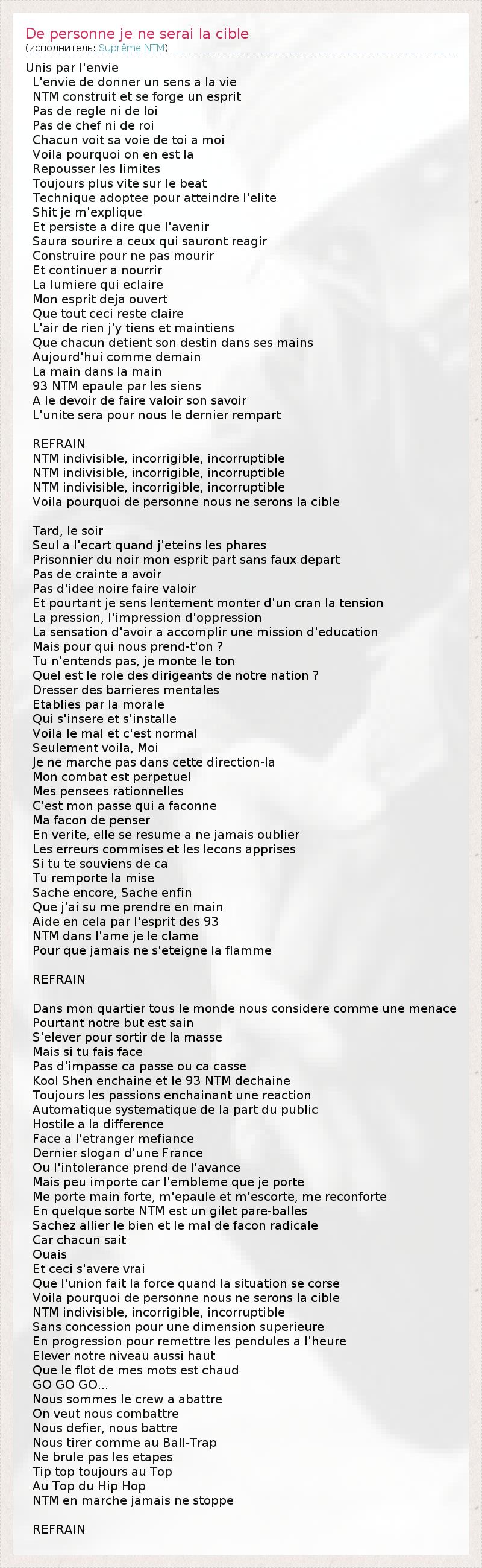 Unis par l'envie L'envie de donner un sens a la vie NTM construit et se forge un esprit Pas de regle ni de loi Pas de chef ni de roi Chacun voit sa voie de toi a moi Voila pourquoi on en est la Repousser les limites Toujours plus vite sur le beat Technique adoptee pour atteindre l'elite Shit je m'explique Et persiste a dire que l'avenir Saura sourire a ceux qui sauront reagir Construire pour ne pas mourir Et continuer a nourrir La lumiere qui eclaire Mon esprit deja ouvert Que tout ceci reste claire L'air de rien j'y tiens et maintiens Que chacun detient son destin dans ses mains Aujourd'hui comme demain La main dans la main 93 NTM epaule par les siens A le devoir de faire valoir son savoir L'unite sera pour nous le dernier rempart REFRAIN NTM indivisible, incorrigible, incorruptible NTM indivisible, incorrigible, incorruptible NTM indivisible, incorrigible, incorruptible Voila pourquoi de personne nous ne serons la cible Tard, le soir Seul a l'ecart quand j'eteins les phares Prisonnier du noir mon esprit part sans faux depart Pas de crainte a avoir Pas d'idee noire faire valoir Et pourtant je sens lentement monter d'un cran la tension La pression, l'impression d'oppression La sensation d'avoir a accomplir une mission d'education Mais pour qui nous prend-t'on ? Tu n'entends pas, je monte le ton Quel est le role des dirigeants de notre nation ? Dresser des barrieres mentales Etablies par la morale Qui s'insere et s'installe Voila le mal et c'est normal Seulement voila, Moi Je ne marche pas dans cette direction-la Mon combat est perpetuel Mes pensees rationnelles C'est mon passe qui a faconne Ma facon de penser En verite, elle se resume a ne jamais oublier Les erreurs commises et les lecons apprises Si tu te souviens de ca Tu remporte la mise Sache encore, Sache enfin Que j'ai su me prendre en main Aide en cela par l'esprit des 93 NTM dans l'ame je le clame Pour que jamais ne s'eteigne la flamme REFRAIN Dans mon quartier tous le monde nous considere comme une menace Pourtant notre but est sain S'elever pour sortir de la masse Mais si tu fais face Pas d'impasse ca passe ou ca casse Kool Shen enchaine et le 93 NTM dechaine Toujours les passions enchainant une reaction Automatique systematique de la part du public Hostile a la difference Face a l'etranger mefiance Dernier slogan d'une France Ou l'intolerance prend de l'avance Mais peu importe car l'embleme que je porte Me porte main forte, m'epaule et m'escorte, me reconforte En quelque sorte NTM est un gilet pare-balles Sachez allier le bien et le mal de facon radicale Car chacun sait Ouais Et ceci s'avere vrai Que l'union fait la force quand la situation se corse Voila pourquoi de personne nous ne serons la cible NTM indivisible, incorrigible, incorruptible Sans concession pour une dimension superieure En progression pour remettre les pendules a l'heure Elever notre niveau aussi haut Que le flot de mes mots est chaud GO GO GO... Nous sommes le crew a abattre On veut nous combattre Nous defier, nous battre Nous tirer comme au Ball-Trap Ne brule pas les etapes Tip top toujours au Top Au Top du Hip Hop NTM en marche jamais ne stoppe REFRAIN