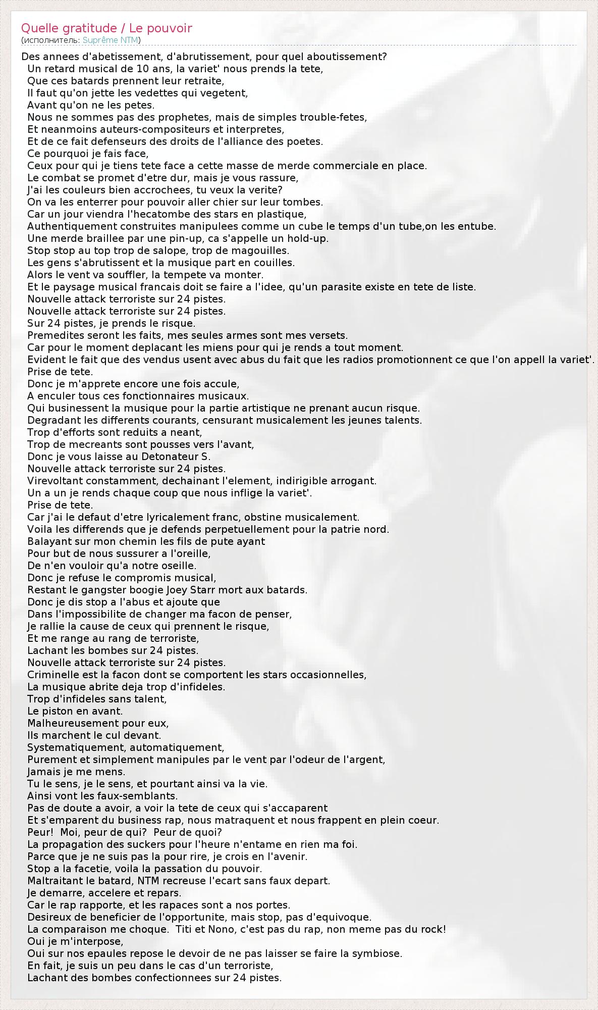 А как ты думаешь, о чем песня "Quelle gratitude / Le pouvoir" ?