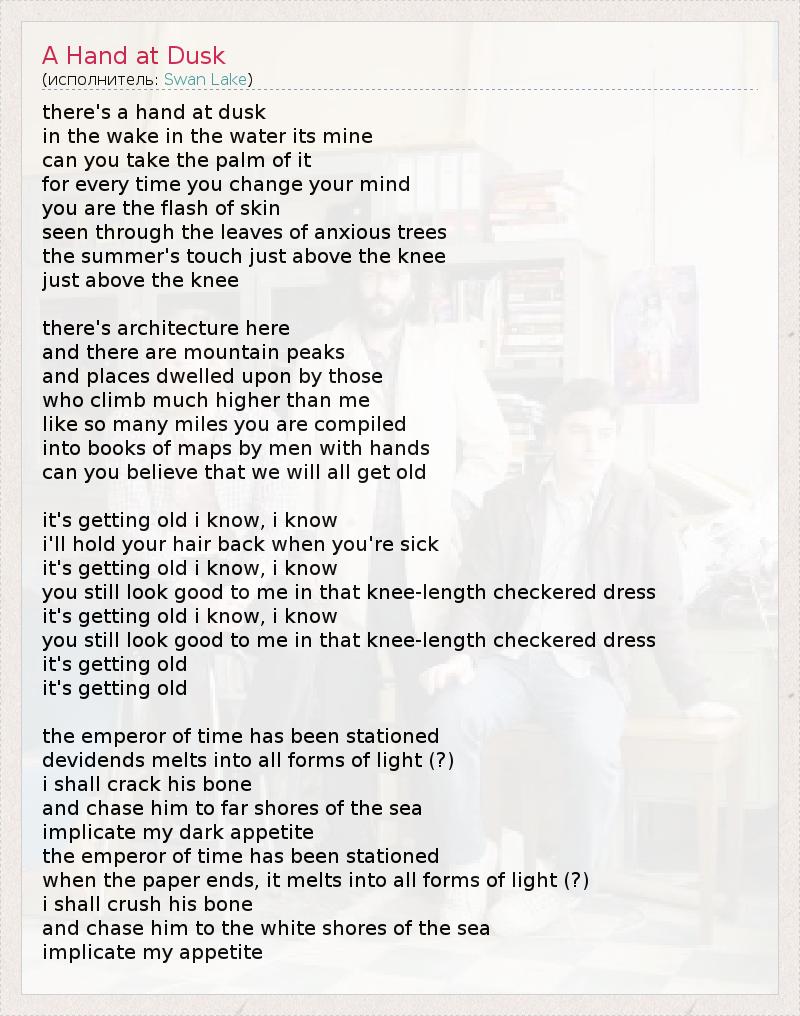 there's a hand at dusk in the wake in the water its mine can you take the palm of it for every time you change your mind you are the flash of skin seen through the leaves of anxious trees the summer's touch just above the knee just above the knee there's architecture here and there are mountain peaks and places dwelled upon by those who climb much higher than me like so many miles you are compiled into books of maps by men with hands can you believe that we will all get old it's getting old i know, i know i'll hold your hair back when you're sick it's getting old i know, i know you still look good to me in that knee-length checkered dress it's getting old i know, i know you still look good to me in that knee-length checkered dress it's getting old it's getting old the emperor of time has been stationed devidends melts into all forms of light (?) i shall crack his bone and chase him to far shores of the sea implicate my dark appetite the emperor of time has been stationed when the paper ends, it melts into all forms of light (?) i shall crush his bone and chase him to the white shores of the sea implicate my appetite