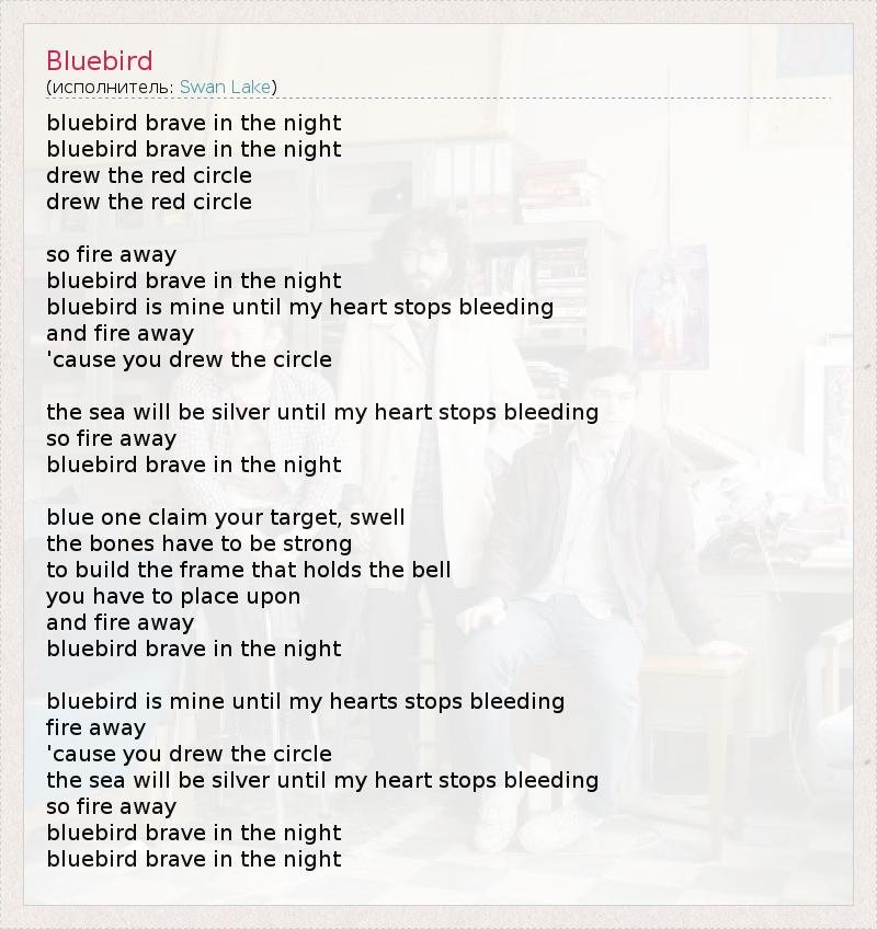 bluebird brave in the night bluebird brave in the night drew the red circle drew the red circle so fire away bluebird brave in the night bluebird is mine until my heart stops bleeding and fire away 'cause you drew the circle the sea will be silver until my heart stops bleeding so fire away bluebird brave in the night blue one claim your target, swell the bones have to be strong to build the frame that holds the bell you have to place upon and fire away bluebird brave in the night bluebird is mine until my hearts stops bleeding fire away 'cause you drew the circle the sea will be silver until my heart stops bleeding so fire away bluebird brave in the night bluebird brave in the night