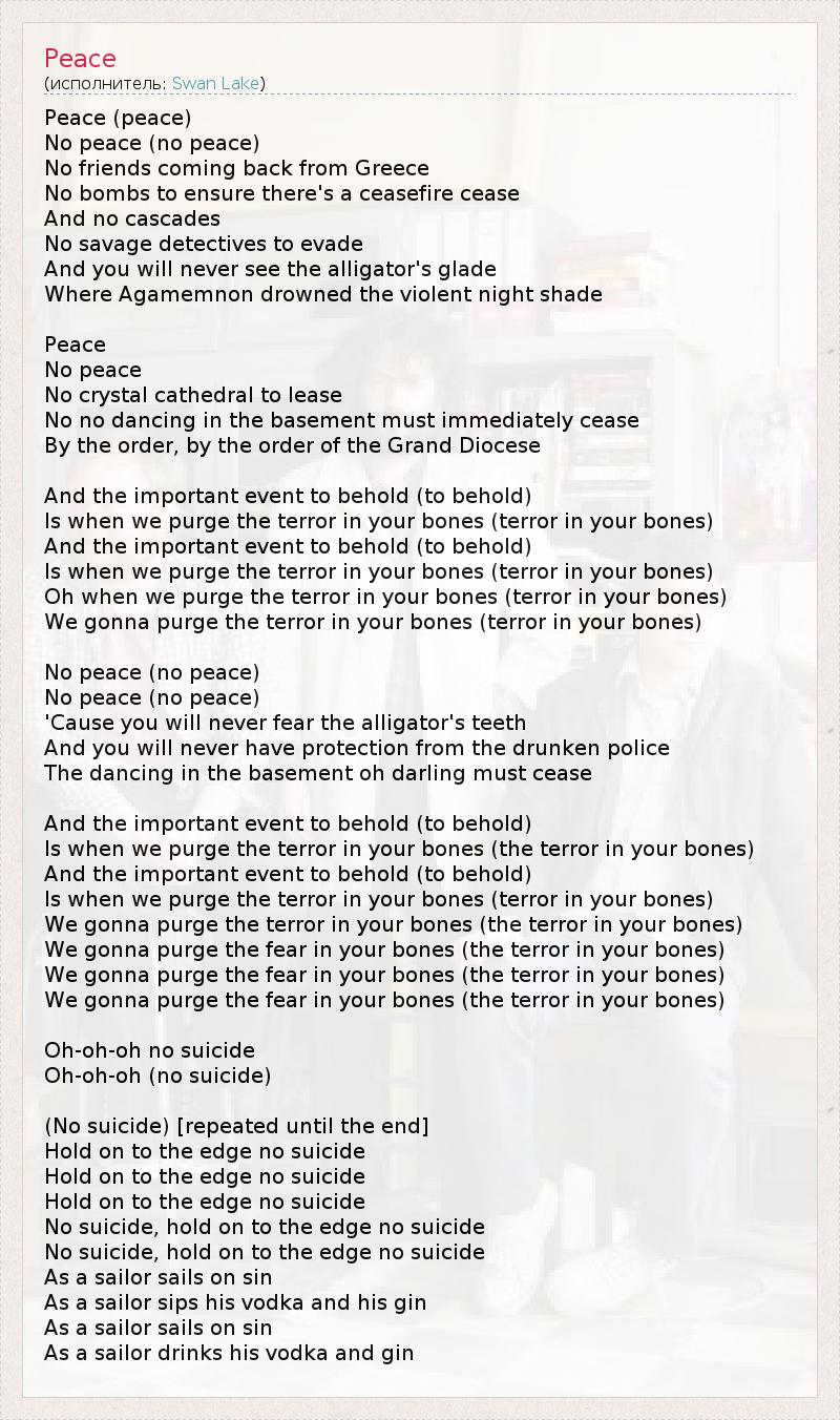 Peace (peace) No peace (no peace) No friends coming back from Greece No bombs to ensure there's a ceasefire cease And no cascades No savage detectives to evade And you will never see the alligator's glade Where Agamemnon drowned the violent night shade Peace No peace No crystal cathedral to lease No no dancing in the basement must immediately cease By the order, by the order of the Grand Diocese And the important event to behold (to behold) Is when we purge the terror in your bones (terror in your bones) And the important event to behold (to behold) Is when we purge the terror in your bones (terror in your bones) Oh when we purge the terror in your bones (terror in your bones) We gonna purge the terror in your bones (terror in your bones) No peace (no peace) No peace (no peace) 'Cause you will never fear the alligator's teeth And you will never have protection from the drunken police The dancing in the basement oh darling must cease And the important event to behold (to behold) Is when we purge the terror in your bones (the terror in your bones) And the important event to behold (to behold) Is when we purge the terror in your bones (terror in your bones) We gonna purge the terror in your bones (the terror in your bones) We gonna purge the fear in your bones (the terror in your bones) We gonna purge the fear in your bones (the terror in your bones) We gonna purge the fear in your bones (the terror in your bones) Oh-oh-oh no suicide Oh-oh-oh (no suicide) (No suicide) [repeated until the end] Hold on to the edge no suicide Hold on to the edge no suicide Hold on to the edge no suicide No suicide, hold on to the edge no suicide No suicide, hold on to the edge no suicide As a sailor sails on sin As a sailor sips his vodka and his gin As a sailor sails on sin As a sailor drinks his vodka and gin