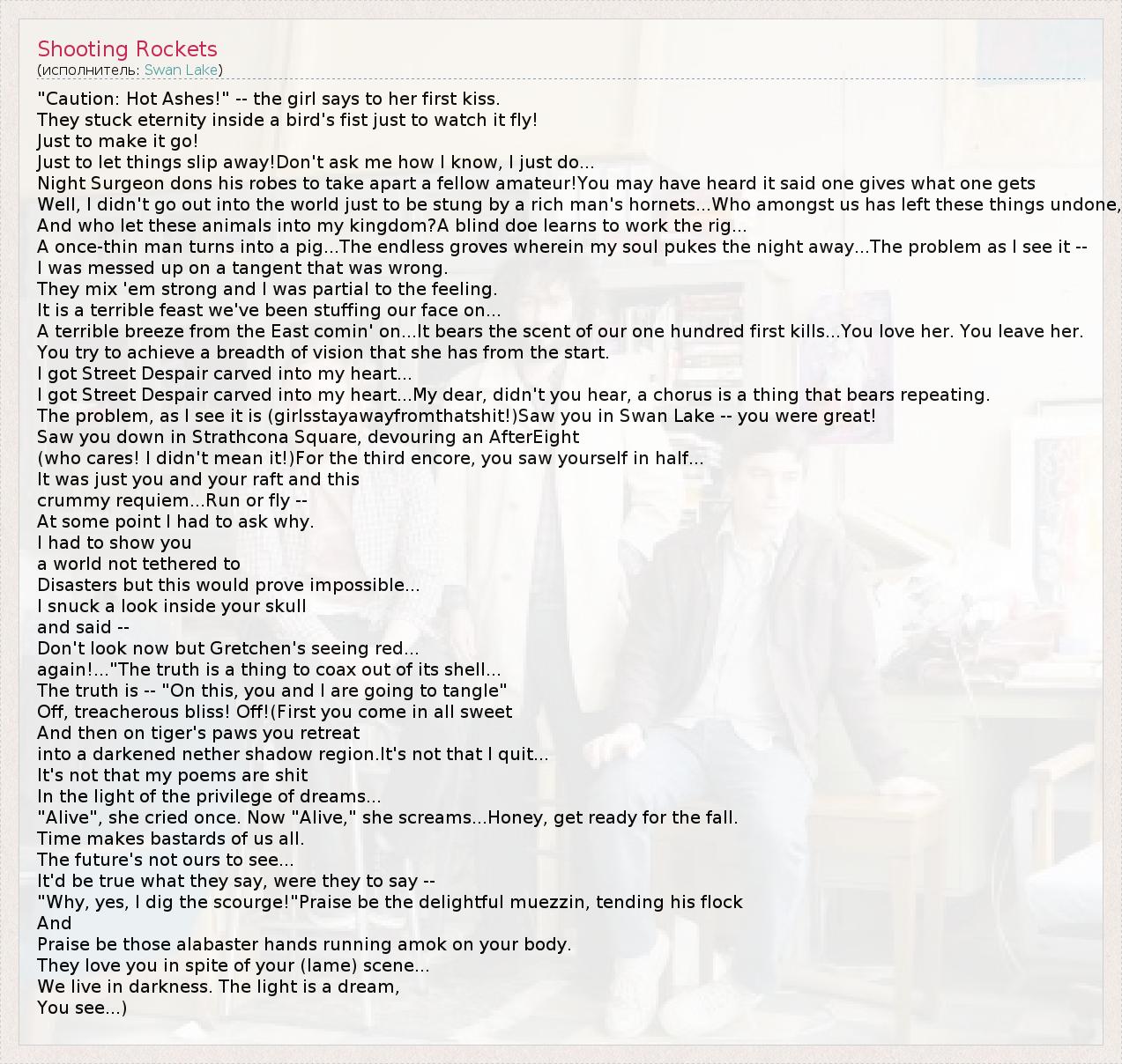 А как ты думаешь, о чем песня "Shooting Rockets" ?