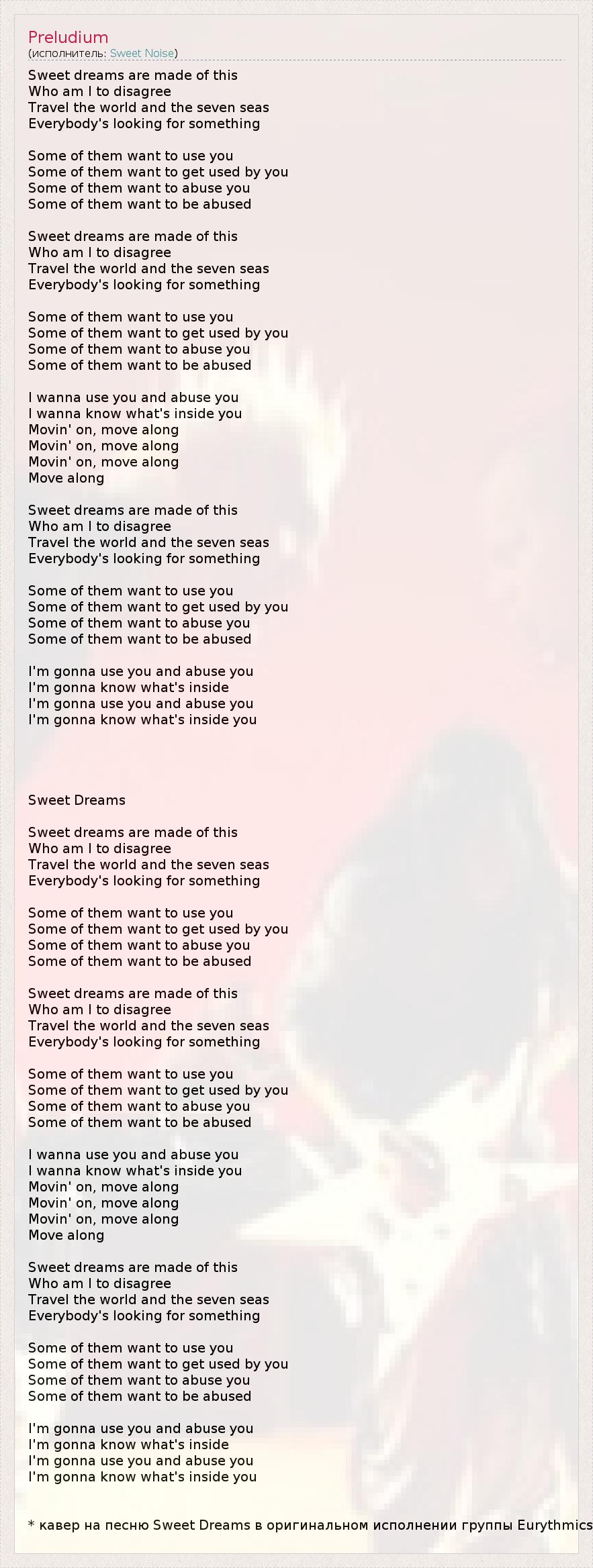 Sweet dreams are made of this Who am I to disagree Travel the world and the seven seas Everybody's looking for something Some of them want to use you Some of them want to get used by you Some of them want to abuse you Some of them want to be abused Sweet dreams are made of this Who am I to disagree Travel the world and the seven seas Everybody's looking for something Some of them want to use you Some of them want to get used by you Some of them want to abuse you Some of them want to be abused I wanna use you and abuse you I wanna know what's inside you Movin' on, move along Movin' on, move along Movin' on, move along Move along Sweet dreams are made of this Who am I to disagree Travel the world and the seven seas Everybody's looking for something Some of them want to use you Some of them want to get used by you Some of them want to abuse you Some of them want to be abused I'm gonna use you and abuse you I'm gonna know what's inside I'm gonna use you and abuse you I'm gonna know what's inside you Sweet Dreams Sweet dreams are made of this Who am I to disagree Travel the world and the seven seas Everybody's looking for something Some of them want to use you Some of them want to get used by you Some of them want to abuse you Some of them want to be abused Sweet dreams are made of this Who am I to disagree Travel the world and the seven seas Everybody's looking for something Some of them want to use you Some of them want to get used by you Some of them want to abuse you Some of them want to be abused I wanna use you and abuse you I wanna know what's inside you Movin' on, move along Movin' on, move along Movin' on, move along Move along Sweet dreams are made of this Who am I to disagree Travel the world and the seven seas Everybody's looking for something Some of them want to use you Some of them want to get used by you Some of them want to abuse you Some of them want to be abused I'm gonna use you and abuse you I'm gonna know what's inside I'm gonna use you and abuse you I'm gonna know what's inside you * кавер на песню Sweet Dreams в оригинальном исполнении группы Eurythmics