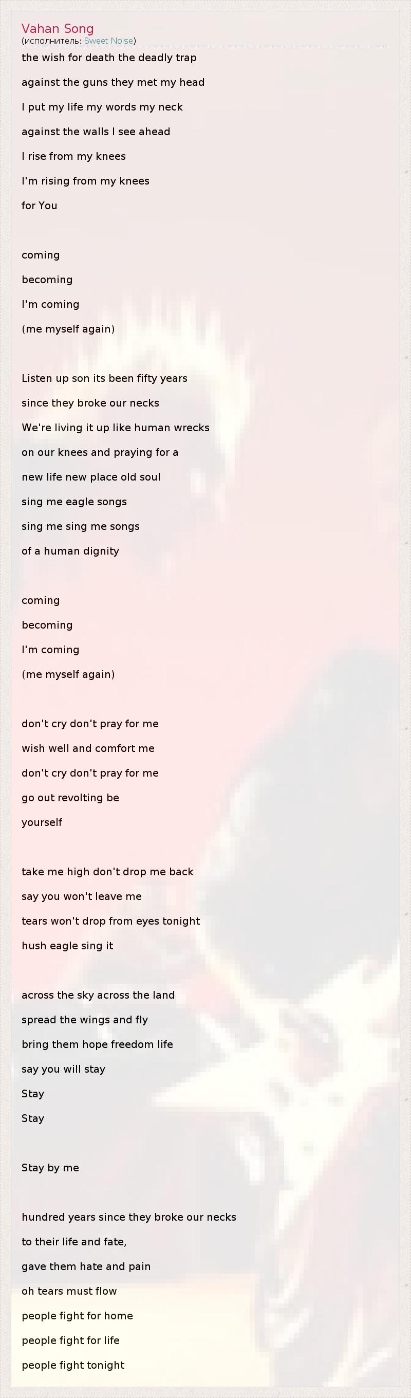 the wish for death the deadly trap against the guns they met my head I put my life my words my neck against the walls I see ahead I rise from my knees I'm rising from my knees for You coming becoming I'm coming (me myself again) Listen up son its been fifty years since they broke our necks We're living it up like human wrecks on our knees and praying for a new life new place old soul sing me eagle songs sing me sing me songs of a human dignity coming becoming I'm coming (me myself again) don't cry don't pray for me wish well and comfort me don't cry don't pray for me go out revolting be yourself take me high don't drop me back say you won't leave me tears won't drop from eyes tonight hush eagle sing it across the sky across the land spread the wings and fly bring them hope freedom life say you will stay Stay Stay Stay by me hundred years since they broke our necks to their life and fate, gave them hate and pain oh tears must flow people fight for home people fight for life people fight tonight