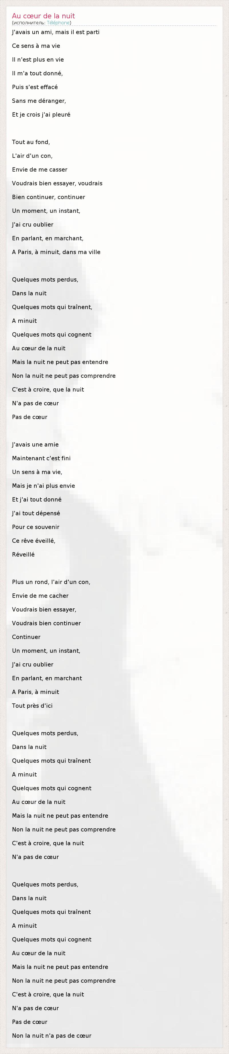 J'avais un ami, mais il est parti Ce sens à ma vie Il n'est plus en vie Il m'a tout donné, Puis s'est effacé Sans me déranger, Et je crois j'ai pleuré Tout au fond, L'air d'un con, Envie de me casser Voudrais bien essayer, voudrais Bien continuer, continuer Un moment, un instant, J'ai cru oublier En parlant, en marchant, A Paris, à minuit, dans ma ville Quelques mots perdus, Dans la nuit Quelques mots qui traînent, A minuit Quelques mots qui cognent Au cœur de la nuit Mais la nuit ne peut pas entendre Non la nuit ne peut pas comprendre C'est à croire, que la nuit N'a pas de cœur Pas de cœur J'avais une amie Maintenant c'est fini Un sens à ma vie, Mais je n'ai plus envie Et j'ai tout donné J'ai tout dépensé Pour ce souvenir Ce rêve éveillé, Réveillé Plus un rond, l'air d'un con, Envie de me cacher Voudrais bien essayer, Voudrais bien continuer Continuer Un moment, un instant, J'ai cru oublier En parlant, en marchant A Paris, à minuit Tout près d'ici Quelques mots perdus, Dans la nuit Quelques mots qui traînent A minuit Quelques mots qui cognent Au cœur de la nuit Mais la nuit ne peut pas entendre Non la nuit ne peut pas comprendre C'est à croire, que la nuit N'a pas de cœur Quelques mots perdus, Dans la nuit Quelques mots qui traînent A minuit Quelques mots qui cognent Au cœur de la nuit Mais la nuit ne peut pas entendre Non la nuit ne peut pas comprendre C'est à croire, que la nuit N'a pas de cœur Pas de cœur Non la nuit n'a pas de cœur