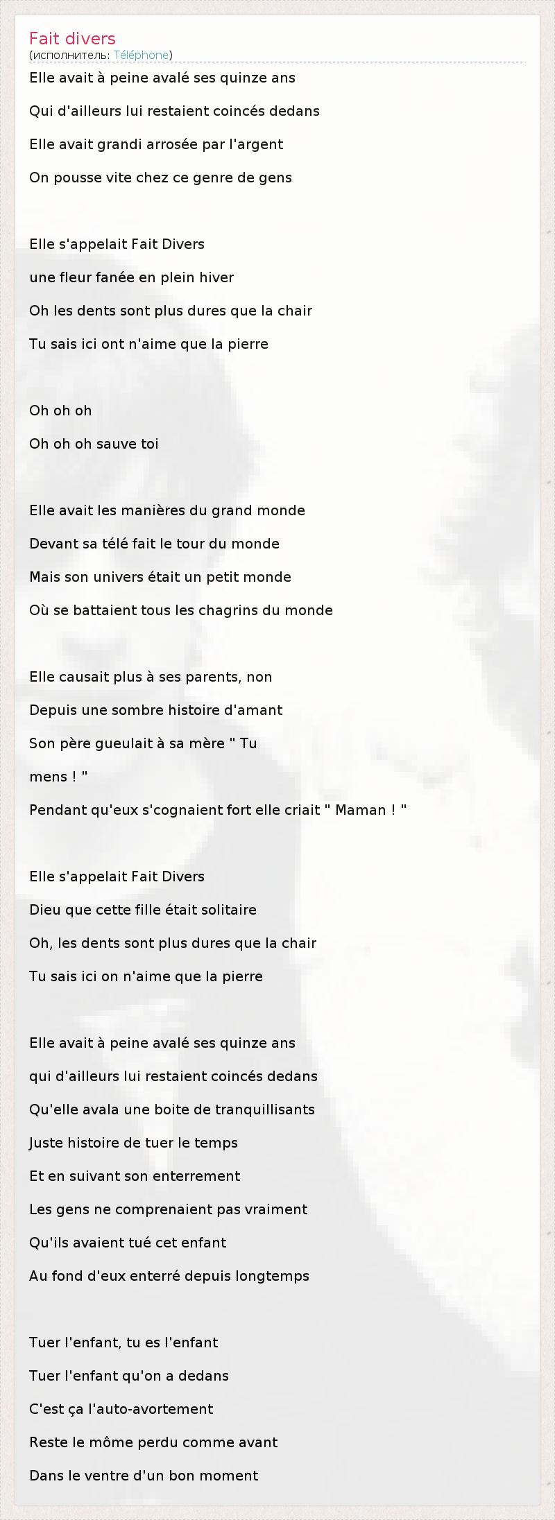 Elle avait à peine avalé ses quinze ans Qui d'ailleurs lui restaient coincés dedans Elle avait grandi arrosée par l'argent On pousse vite chez ce genre de gens Elle s'appelait Fait Divers une fleur fanée en plein hiver Oh les dents sont plus dures que la chair Tu sais ici ont n'aime que la pierre Oh oh oh Oh oh oh sauve toi Elle avait les manières du grand monde Devant sa télé fait le tour du monde Mais son univers était un petit monde Où se battaient tous les chagrins du monde Elle causait plus à ses parents, non Depuis une sombre histoire d'amant Son père gueulait à sa mère " Tu mens ! " Pendant qu'eux s'cognaient fort elle criait " Maman ! " Elle s'appelait Fait Divers Dieu que cette fille était solitaire Oh, les dents sont plus dures que la chair Tu sais ici on n'aime que la pierre Elle avait à peine avalé ses quinze ans qui d'ailleurs lui restaient coincés dedans Qu'elle avala une boite de tranquillisants Juste histoire de tuer le temps Et en suivant son enterrement Les gens ne comprenaient pas vraiment Qu'ils avaient tué cet enfant Au fond d'eux enterré depuis longtemps Tuer l'enfant, tu es l'enfant Tuer l'enfant qu'on a dedans C'est ça l'auto-avortement Reste le môme perdu comme avant Dans le ventre d'un bon moment