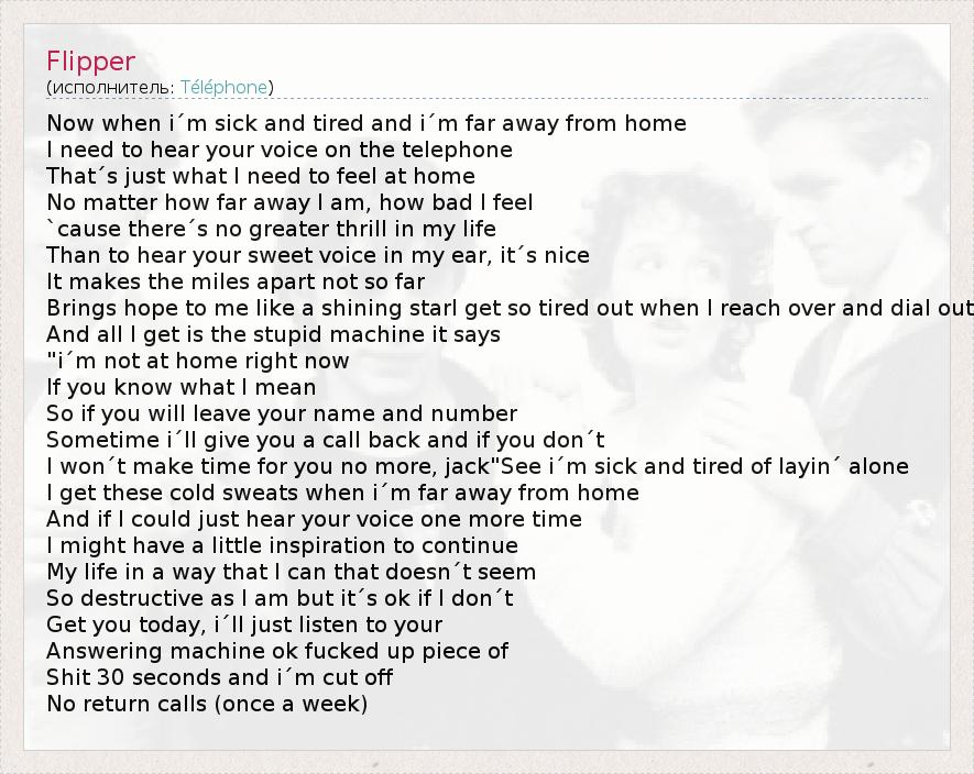 Now when i´m sick and tired and i´m far away from home I need to hear your voice on the telephone That´s just what I need to feel at home No matter how far away I am, how bad I feel `cause there´s no greater thrill in my life Than to hear your sweet voice in my ear, it´s nice It makes the miles apart not so far Brings hope to me like a shining starI get so tired out when I reach over and dial out And all I get is the stupid machine it says "i´m not at home right now If you know what I mean So if you will leave your name and number Sometime i´ll give you a call back and if you don´t I won´t make time for you no more, jack"See i´m sick and tired of layin´ alone I get these cold sweats when i´m far away from home And if I could just hear your voice one more time I might have a little inspiration to continue My life in a way that I can that doesn´t seem So destructive as I am but it´s ok if I don´t Get you today, i´ll just listen to your Answering machine ok fucked up piece of Shit 30 seconds and i´m cut off No return calls (once a week)