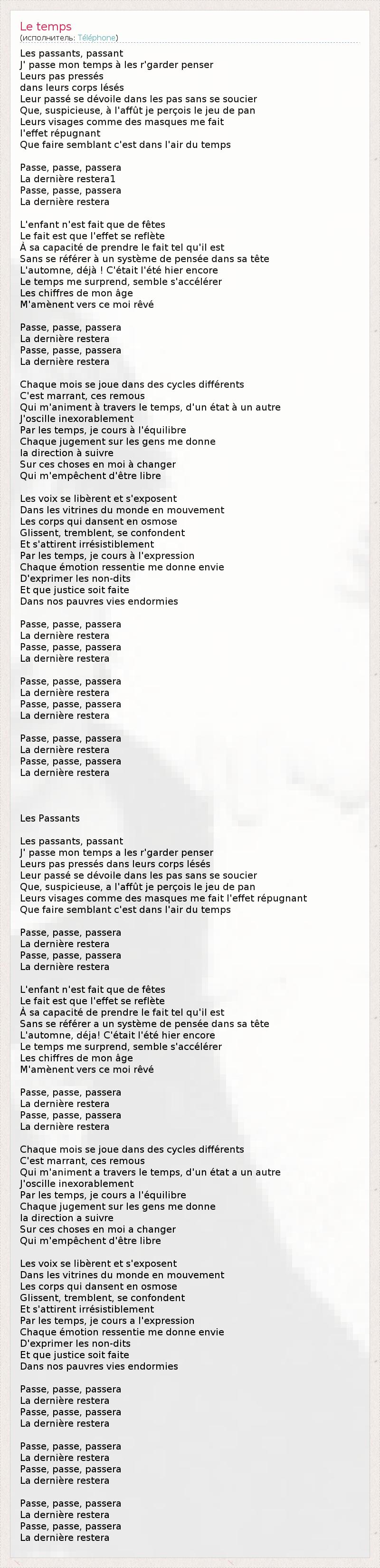 Les passants, passant J' passe mon temps à les r'garder penser Leurs pas pressés dans leurs corps lésés Leur passé se dévoile dans les pas sans se soucier Que, suspicieuse, à l'affût je perçois le jeu de pan Leurs visages comme des masques me fait l'effet répugnant Que faire semblant c'est dans l'air du temps Passe, passe, passera La dernière restera1 Passe, passe, passera La dernière restera L'enfant n'est fait que de fêtes Le fait est que l'effet se reflète À sa capacité de prendre le fait tel qu'il est Sans se référer à un système de pensée dans sa tête L'automne, déjà ! C'était l'été hier encore Le temps me surprend, semble s'accélérer Les chiffres de mon âge M'amènent vers ce moi rêvé Passe, passe, passera La dernière restera Passe, passe, passera La dernière restera Chaque mois se joue dans des cycles différents C'est marrant, ces remous Qui m'animent à travers le temps, d'un état à un autre J'oscille inexorablement Par les temps, je cours à l'équilibre Chaque jugement sur les gens me donne la direction à suivre Sur ces choses en moi à changer Qui m'empêchent d'être libre Les voix se libèrent et s'exposent Dans les vitrines du monde en mouvement Les corps qui dansent en osmose Glissent, tremblent, se confondent Et s'attirent irrésistiblement Par les temps, je cours à l'expression Chaque émotion ressentie me donne envie D'exprimer les non-dits Et que justice soit faite Dans nos pauvres vies endormies Passe, passe, passera La dernière restera Passe, passe, passera La dernière restera Passe, passe, passera La dernière restera Passe, passe, passera La dernière restera Passe, passe, passera La dernière restera Passe, passe, passera La dernière restera Les Passants Les passants, passant J' passe mon temps a les r'garder penser Leurs pas pressés dans leurs corps lésés Leur passé se dévoile dans les pas sans se soucier Que, suspicieuse, a l'affût je perçois le jeu de pan Leurs visages comme des masques me fait l'effet répugnant Que faire semblant c'est dans l'air du temps Passe, passe, passera La dernière restera Passe, passe, passera La dernière restera L'enfant n'est fait que de fêtes Le fait est que l'effet se reflète À sa capacité de prendre le fait tel qu'il est Sans se référer a un système de pensée dans sa tête L'automne, déja! C'était l'été hier encore Le temps me surprend, semble s'accélérer Les chiffres de mon âge M'amènent vers ce moi rêvé Passe, passe, passera La dernière restera Passe, passe, passera La dernière restera Chaque mois se joue dans des cycles différents C'est marrant, ces remous Qui m'animent a travers le temps, d'un état a un autre J'oscille inexorablement Par les temps, je cours a l'équilibre Chaque jugement sur les gens me donne la direction a suivre Sur ces choses en moi a changer Qui m'empêchent d'être libre Les voix se libèrent et s'exposent Dans les vitrines du monde en mouvement Les corps qui dansent en osmose Glissent, tremblent, se confondent Et s'attirent irrésistiblement Par les temps, je cours a l'expression Chaque émotion ressentie me donne envie D'exprimer les non-dits Et que justice soit faite Dans nos pauvres vies endormies Passe, passe, passera La dernière restera Passe, passe, passera La dernière restera Passe, passe, passera La dernière restera Passe, passe, passera La dernière restera Passe, passe, passera La dernière restera Passe, passe, passera La dernière restera