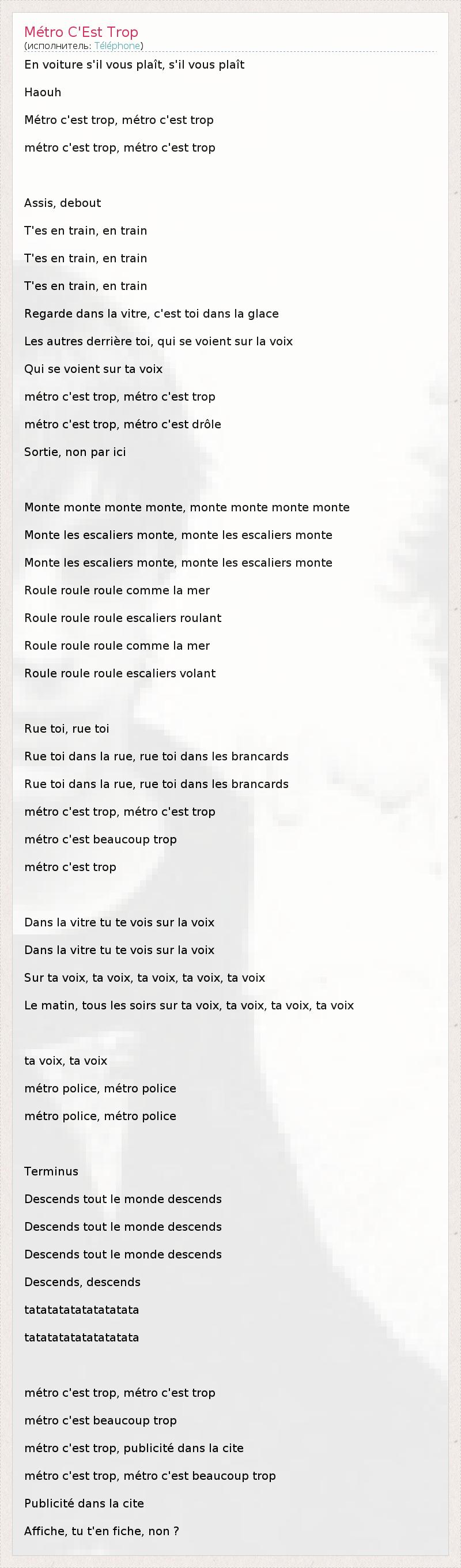 En voiture s'il vous plaît, s'il vous plaît Haouh Métro c'est trop, métro c'est trop métro c'est trop, métro c'est trop Assis, debout T'es en train, en train T'es en train, en train T'es en train, en train Regarde dans la vitre, c'est toi dans la glace Les autres derrière toi, qui se voient sur la voix Qui se voient sur ta voix métro c'est trop, métro c'est trop métro c'est trop, métro c'est drôle Sortie, non par ici Monte monte monte monte, monte monte monte monte Monte les escaliers monte, monte les escaliers monte Monte les escaliers monte, monte les escaliers monte Roule roule roule comme la mer Roule roule roule escaliers roulant Roule roule roule comme la mer Roule roule roule escaliers volant Rue toi, rue toi Rue toi dans la rue, rue toi dans les brancards Rue toi dans la rue, rue toi dans les brancards métro c'est trop, métro c'est trop métro c'est beaucoup trop métro c'est trop Dans la vitre tu te vois sur la voix Dans la vitre tu te vois sur la voix Sur ta voix, ta voix, ta voix, ta voix, ta voix Le matin, tous les soirs sur ta voix, ta voix, ta voix, ta voix ta voix, ta voix métro police, métro police métro police, métro police Terminus Descends tout le monde descends Descends tout le monde descends Descends tout le monde descends Descends, descends tatatatatatatatatata tatatatatatatatatata métro c'est trop, métro c'est trop métro c'est beaucoup trop métro c'est trop, publicité dans la cite métro c'est trop, métro c'est beaucoup trop Publicité dans la cite Affiche, tu t'en fiche, non ?