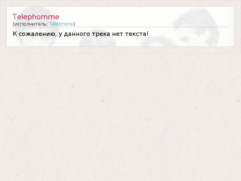 Алле, алле, детка, ты звонил? Я ничего не слышу, У меня нет связи. Я в клубе, ты слышишь, понимаешь?? Чё, чё, что ты сказал, а? Ты решил порвать со мной? Извини, я не слышу тебя! Я немного занята, Немного занята, Немного занята, Прости, я не слышу тебя, я немного занята... А ну-ка, секундочку, Ой, сейчас будет играть моя любимая песня. Я не могу написать тебе смс, у меня выпивка в руках, а? Тебе нужно было заранее пригласить меня куда-нибудь, Ведь ты знал, что я была свободна, А теперь ты не перестаешь звонить мне, Я немного занята. Хватит звонить, Хватит звонить! Я не хочу ни о чем думать сейчас, Я вся на танцполе*... Хватит звонить, Хватит звонить! Я не хочу разговаривать больше, Я вся на танцполе... Э-э-э-э-э-э Хватит звонить! Мне-е-е-е-е-е-е-е-е Я занята э-э-э-э-э Хватит названивать! Мне-е-е-е-е-е Да, ты можешь звонить, сколько захочешь, но я не отвечу, И ты не дозвонишься на мой телефон, Потому что я в клубе, И я попиваю крепкие напитки. Ты не дозвонишься на мой телефон. Парень, зачем ты обрываешь мой телефон? Это не заставит меня уйти отсюда пораньше, Пораньше одеться, И бросить своих подружек. Мне надо было оставить телефон дома, Это просто катастрофа! Ты звонишь, как коллектор, Извини, я не могу ответить.... Это не потому, что ты мне не нравишься, Я просто отдыхаю на вечеринке, Я устала от звонков моего телефона. Мне кажется, я как Смольный, Сегодня вечером никаких звонков, Потому что я буду танцевать. Хватит звонить, Хватит звонить! Я не хочу ни о чем думать сейчас, Я вся на танцполе... Хватит звонить, Хватит звонить! Я не хочу разговаривать больше, Я вся на танцполе... Э-э-э-э-э-э Хватит звонить Мне-е-е-е-е-е-е-е-е Я занята э-э-э-э-э Хватит названивать Мне-е-е-е-е-е Да ты можешь звонить, сколько захочешь, но я не отвечу, И ты не дозвонишься на мой телефон. Потому что я в клубе И попиваю крепкие напитки. Ты не дозвонишься на мой телефон, Мой телефон, Мой мой мой телефон! Потому что я в клубе И попиваю крепкие напитки... Ты не дозвонишься на мой телефон... * - дословно: мои мысли и сердце остались на танцполе Телефон (перевод slavik4289 из Уфы) Привет, малыш, Ты мне звонишь, но тебя плохо слышно. Здесь плохая связь. Я в клубе и ты об этом знаешь. Что ты говоришь? А, ты хочешь со мной расстаться? Извини, я не слышу тебя. Я занята, позвони потом. Я занята! Перезвони попозже. Извини, тебя плохо слышно, перезвони попозже. Подожди, Включили мою любимую песню. Я не могу отправить тебе СМС С напитком в руке. У тебя появились какие-то планы по поводу меня, Ты ведь знал, что я была свободна, А теперь у меня дела! Хватит мне названивать! Хватит звонить, Я не хочу ни о чём думать! Я перемещаюсь на танцпол, посторонние меня не волнуют! Хватит звонить, Поговорим потом! Я перемещаюсь на танцпол, посторонние меня не волнуют! Эй, Прекрати названивать! Эй, Я занята! Эй, Забудь мой номер! Эй! Звони, куда хочешь, Но у меня дома никого нет, И от до меня не дозвонишься! Выйду из клуба С бутылкой в руке, И мне уже плевать, что ты звонил! Звони когда хочешь, Но у меня дома никого не будет, И ты до меня не дозвонишься! Сейчас я в клубе С бутылкой крепкого пива, И мне плевать, что ты звонил! [Beyonce:] Если ты обрываешь мой телефон, Это ещё не значит, что я уйду из клуба раньше! Нужно было оставить телефон дома, Твои звонки доведут меня до могилы! Названиваешь каждую минуту, Но я всё равно тебе не отвечу! Не то, чтобы ты мне не нравился, Просто я хочу оторваться по 