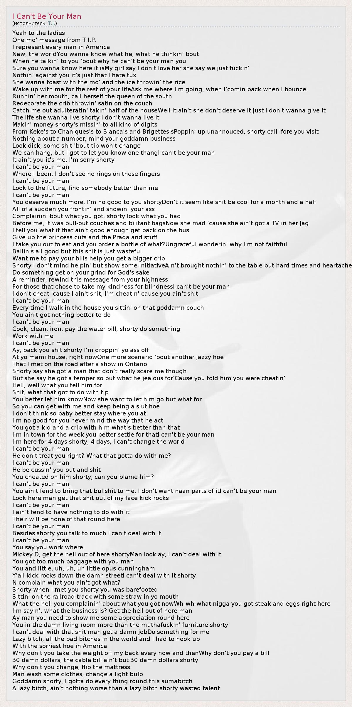 Yeah to the ladies One mo' message from T.I.P. I represent every man in America Naw, the worldYou wanna know what he, what he thinkin' bout When he talkin' to you 'bout why he can't be your man you Sure you wanna know here it isMy girl say I don't love her she say we just fuckin' Nothin' against you it's just that I hate tux She wanna toast with the mo' and the ice throwin' the rice Wake up with me for the rest of your lifeAsk me where I'm going, when I'comin back when I bounce Runnin' her mouth, call herself the queen of the south Redecorate the crib throwin' satin on the couch Catch me out adulteratin' takin' half of the houseWell it ain't she don't deserve it just I don't wanna give it The life she wanna live shorty I don't wanna live it Makin' money shorty's missin' to all kind of digits From Keke's to Chaniques's to Bianca's and Brigettes'sPoppin' up unannouced, shorty call 'fore you visit Nothing about a number, mind your goddamn business Look dick, some shit 'bout tip won't change We can hang, but I got to let you know one thangI can't be your man It ain't you it's me, I'm sorry shorty I can't be your man Where I been, I don't see no rings on these fingers I can't be your man Look to the future, find somebody better than me I can't be your man You deserve much more, I'm no good to you shortyDon't it seem like shit be cool for a month and a half All of a sudden you frontin' and showin' your ass Complainin' bout what you got, shorty look what you had Before me, it was pull-out couches and bilitant bagsNow she mad 'cause she ain't got a TV in her Jag I tell you what if that ain't good enough get back on the bus Give up the princess cuts and the Prada and stuff I take you out to eat and you order a bottle of what?Ungrateful wonderin' why I'm not faithful Ballin's all good but this shit is just wasteful Want me to pay your bills help you get a bigger crib Shorty I don't mind helpin' but show some initiativeAin't brought nothin' to the table but hard times and heartache Do something get on your grind for God's sake A reminder, rewind this message from your highness For those that chose to take my kindness for blindnessI can't be your man I don't cheat 'cause I ain't shit, I'm cheatin' cause you ain't shit I can't be your man Every time I walk in the house you sittin' on that goddamn couch You ain't got nothing better to do I can't be your man Cook, clean, iron, pay the water bill, shorty do something Work with me I can't be your man Ay, pack you shit shorty I'm droppin' yo ass off At yo mami house, right nowOne more scenario 'bout another jazzy hoe That I met on the road after a show in Ontario Shorty say she got a man that don't really scare me though But she say he got a temper so but what he jealous for'Cause you told him you were cheatin' Hell, well what you tell him for Shit, what that got to do with tip You better let him knowNow she want to let him go but what for So you can get with me and keep being a slut hoe I don't think so baby better stay where you at I'm no good for you never mind the way that he act You got a kid and a crib with him what's better than that I'm in town for the week you better settle for thatI can't be your man I'm here for 4 days shorty, 4 days, I can't change the world I can't be your man He don't treat you right? What that gotta do with me? I can't be your man He be cussin' you out and shit You cheated on him shorty, can you blame him? I can't be your man You ain't fend to bring that bullshit to me, I don't want naan parts of itI can't be your man Look here man get that shit out of my face kick rocks I can't be your man I ain't fend to have nothing to do with it Their will be none of that round here I can't be your man Besides shorty you talk to much I can't deal with it I can't be your man You say you work where Mickey D, get the hell out of here shortyMan look ay, I can't deal with it You got too much baggage with you man You and little, uh, uh, uh little opus cunningham Y'all kick rocks down the damn streetI can't deal with it shorty N complain what you ain't got what? Shorty when I met you shorty you was barefooted Sittin' on the railroad track with some straw in yo mouth What the hell you complainin' about what you got nowWh-wh-what nigga you got steak and eggs right here I'm sayin', what the business is? Get the hell out of here man Ay man you need to show me some appreciation round here You in the damn living room more than the muthafuckin' furniture shorty I can't deal with that shit man get a damn jobDo something for me Lazy bitch, all the bad bitches in the world and I had to hook up With the sorriest hoe in America Why don't you take the weight off my back every now and thenWhy don't you pay a bill 30 damn dollars, the cable bill ain't but 30 damn dollars shorty Why don't you change, flip the mattress Man wash some clothes, change a light bulb Goddamn shorty, I gotta do every thing round this sumabitch A lazy bitch, ain't nothing worse than a lazy bitch shorty wasted talent