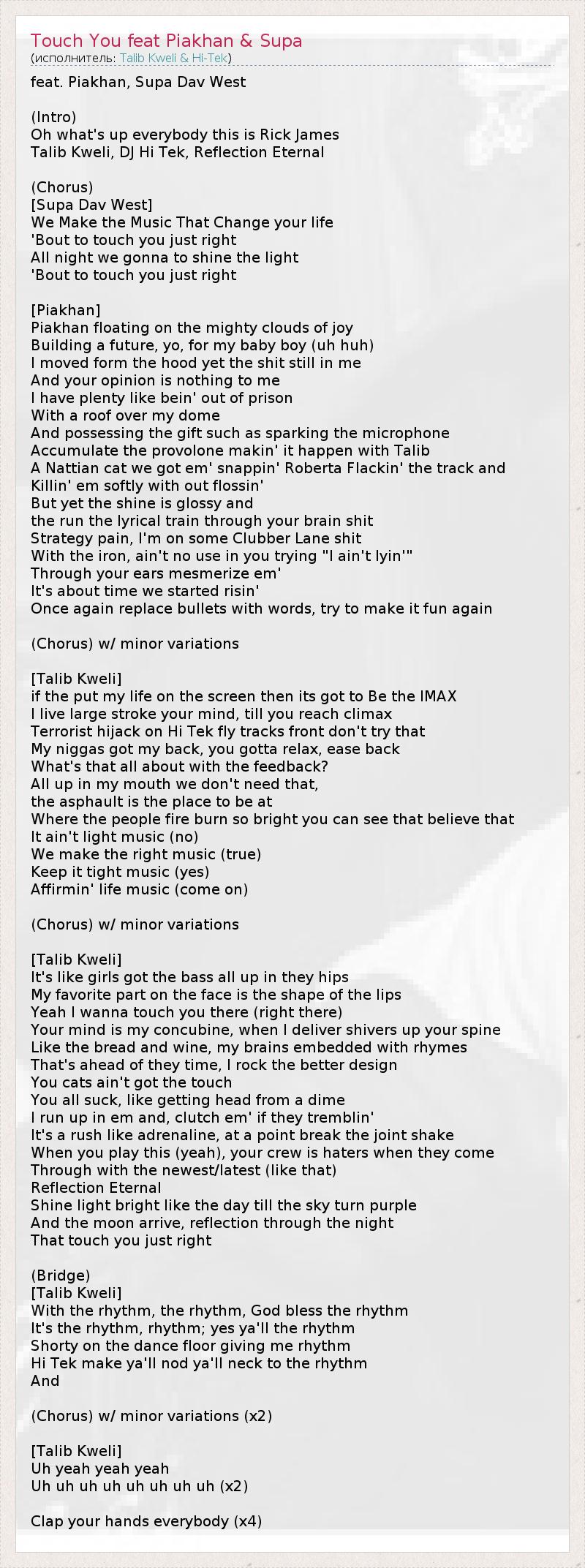 feat. Piakhan, Supa Dav West (Intro) Oh what's up everybody this is Rick James Talib Kweli, DJ Hi Tek, Reflection Eternal (Chorus) [Supa Dav West] We Make the Music That Change your life 'Bout to touch you just right All night we gonna to shine the light 'Bout to touch you just right [Piakhan] Piakhan floating on the mighty clouds of joy Building a future, yo, for my baby boy (uh huh) I moved form the hood yet the shit still in me And your opinion is nothing to me I have plenty like bein' out of prison With a roof over my dome And possessing the gift such as sparking the microphone Accumulate the provolone makin' it happen with Talib A Nattian cat we got em' snappin' Roberta Flackin' the track and Killin' em softly with out flossin' But yet the shine is glossy and the run the lyrical train through your brain shit Strategy pain, I'm on some Clubber Lane shit With the iron, ain't no use in you trying "I ain't lyin'" Through your ears mesmerize em' It's about time we started risin' Once again replace bullets with words, try to make it fun again (Chorus) w/ minor variations [Talib Kweli] if the put my life on the screen then its got to Be the IMAX I live large stroke your mind, till you reach climax Terrorist hijack on Hi Tek fly tracks front don't try that My niggas got my back, you gotta relax, ease back What's that all about with the feedback? All up in my mouth we don't need that, the asphault is the place to be at Where the people fire burn so bright you can see that believe that It ain't light music (no) We make the right music (true) Keep it tight music (yes) Affirmin' life music (come on) (Chorus) w/ minor variations [Talib Kweli] It's like girls got the bass all up in they hips My favorite part on the face is the shape of the lips Yeah I wanna touch you there (right there) Your mind is my concubine, when I deliver shivers up your spine Like the bread and wine, my brains embedded with rhymes That's ahead of they time, I rock the better design You cats ain't got the touch You all suck, like getting head from a dime I run up in em and, clutch em' if they tremblin' It's a rush like adrenaline, at a point break the joint shake When you play this (yeah), your crew is haters when they come Through with the newest/latest (like that) Reflection Eternal Shine light bright like the day till the sky turn purple And the moon arrive, reflection through the night That touch you just right (Bridge) [Talib Kweli] With the rhythm, the rhythm, God bless the rhythm It's the rhythm, rhythm; yes ya'll the rhythm Shorty on the dance floor giving me rhythm Hi Tek make ya'll nod ya'll neck to the rhythm And (Chorus) w/ minor variations (x2) [Talib Kweli] Uh yeah yeah yeah Uh uh uh uh uh uh uh uh (x2) Clap your hands everybody (x4)
