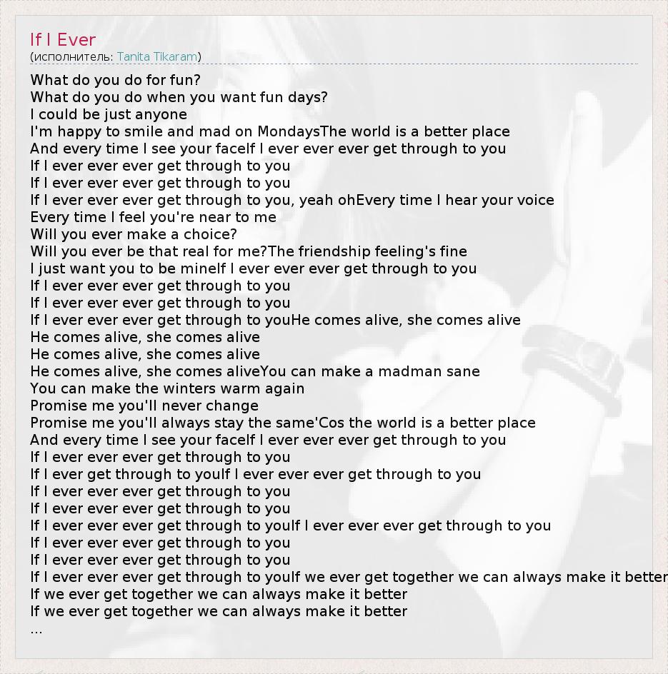 What do you do for fun? What do you do when you want fun days? I could be just anyone I'm happy to smile and mad on MondaysThe world is a better place And every time I see your faceIf I ever ever ever get through to you If I ever ever ever get through to you If I ever ever ever get through to you If I ever ever ever get through to you, yeah ohEvery time I hear your voice Every time I feel you're near to me Will you ever make a choice? Will you ever be that real for me?The friendship feeling's fine I just want you to be mineIf I ever ever ever get through to you If I ever ever ever get through to you If I ever ever ever get through to you If I ever ever ever get through to youHe comes alive, she comes alive He comes alive, she comes alive He comes alive, she comes alive He comes alive, she comes aliveYou can make a madman sane You can make the winters warm again Promise me you'll never change Promise me you'll always stay the same'Cos the world is a better place And every time I see your faceIf I ever ever ever get through to you If I ever ever ever get through to you If I ever get through to youIf I ever ever ever get through to you If I ever ever ever get through to you If I ever ever ever get through to you If I ever ever ever get through to youIf I ever ever ever get through to you If I ever ever ever get through to you If I ever ever ever get through to you If I ever ever ever get through to youIf we ever get together we can always make it better If we ever get together we can always make it better If we ever get together we can always make it better ...