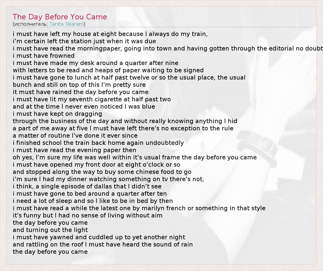 А как ты думаешь, о чем песня "The Day Before You Came" ?