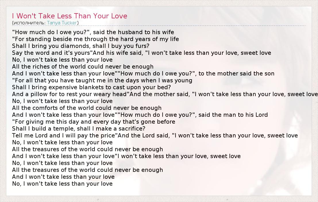 ГлавнаяИсполнителиTanya TuckerI Won't Take Less Than Your Love