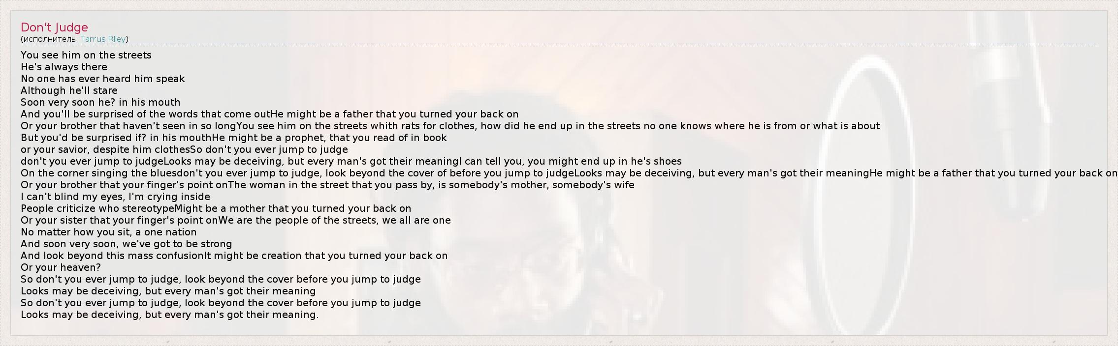 You see him on the streets He's always there No one has ever heard him speak Although he'll stare Soon very soon he? in his mouth And you'll be surprised of the words that come outHe might be a father that you turned your back on Or your brother that haven't seen in so longYou see him on the streets whith rats for clothes, how did he end up in the streets no one knows where he is from or what is about But you'd be surprised if? in his mouthHe might be a prophet, that you read of in book or your savior, despite him clothesSo don't you ever jump to judge don't you ever jump to judgeLooks may be deceiving, but every man's got their meaningI can tell you, you might end up in he's shoes On the corner singing the bluesdon't you ever jump to judge, look beyond the cover of before you jump to judgeLooks may be deceiving, but every man's got their meaningHe might be a father that you turned your back on Or your brother that your finger's point onThe woman in the street that you pass by, is somebody's mother, somebody's wife I can't blind my eyes, I'm crying inside People criticize who stereotypeMight be a mother that you turned your back on Or your sister that your finger's point onWe are the people of the streets, we all are one No matter how you sit, a one nation And soon very soon, we've got to be strong And look beyond this mass confusionIt might be creation that you turned your back on Or your heaven? So don't you ever jump to judge, look beyond the cover before you jump to judge Looks may be deceiving, but every man's got their meaning So don't you ever jump to judge, look beyond the cover before you jump to judge Looks may be deceiving, but every man's got their meaning.