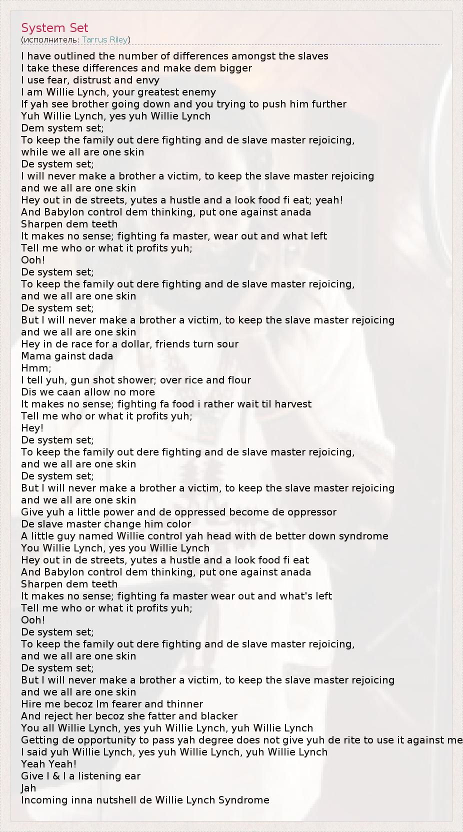 I have outlined the number of differences amongst the slaves I take these differences and make dem bigger I use fear, distrust and envy I am Willie Lynch, your greatest enemy If yah see brother going down and you trying to push him further Yuh Willie Lynch, yes yuh Willie Lynch Dem system set; To keep the family out dere fighting and de slave master rejoicing, while we all are one skin De system set; I will never make a brother a victim, to keep the slave master rejoicing and we all are one skin Hey out in de streets, yutes a hustle and a look food fi eat; yeah! And Babylon control dem thinking, put one against anada Sharpen dem teeth It makes no sense; fighting fa master, wear out and what left Tell me who or what it profits yuh; Ooh! De system set; To keep the family out dere fighting and de slave master rejoicing, and we all are one skin De system set; But I will never make a brother a victim, to keep the slave master rejoicing and we all are one skin Hey in de race for a dollar, friends turn sour Mama gainst dada Hmm; I tell yuh, gun shot shower; over rice and flour Dis we caan allow no more It makes no sense; fighting fa food i rather wait til harvest Tell me who or what it profits yuh; Hey! De system set; To keep the family out dere fighting and de slave master rejoicing, and we all are one skin De system set; But I will never make a brother a victim, to keep the slave master rejoicing and we all are one skin Give yuh a little power and de oppressed become de oppressor De slave master change him color A little guy named Willie control yah head with de better down syndrome You Willie Lynch, yes you Willie Lynch Hey out in de streets, yutes a hustle and a look food fi eat And Babylon control dem thinking, put one against anada Sharpen dem teeth It makes no sense; fighting fa master wear out and what's left Tell me who or what it profits yuh; Ooh! De system set; To keep the family out dere fighting and de slave master rejoicing, and we all are one skin De system set; But I will never make a brother a victim, to keep the slave master rejoicing and we all are one skin Hire me becoz Im fearer and thinner And reject her becoz she fatter and blacker You all Willie Lynch, yes yuh Willie Lynch, yuh Willie Lynch Getting de opportunity to pass yah degree does not give yuh de rite to use it against me I said yuh Willie Lynch, yes yuh Willie Lynch, yuh Willie Lynch Yeah Yeah! Give I & I a listening ear Jah Incoming inna nutshell de Willie Lynch Syndrome
