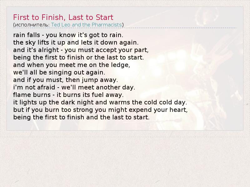 А как ты думаешь, о чем песня "First to Finish, Last to Start" ?