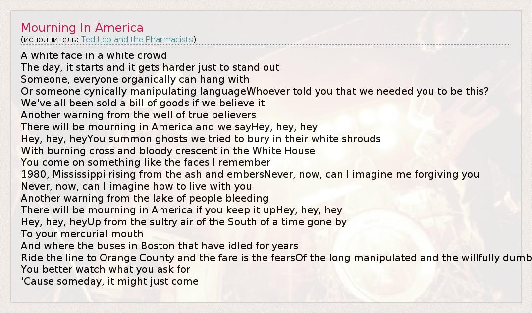 А как ты думаешь, о чем песня "Mourning In America" ?