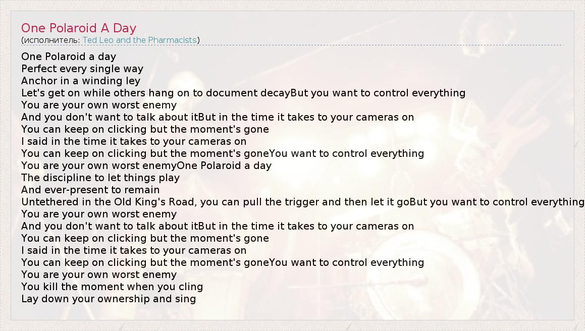 А как ты думаешь, о чем песня "One Polaroid A Day" ?