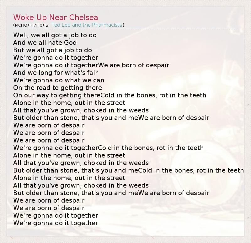 А как ты думаешь, о чем песня "Woke Up Near Chelsea" ?