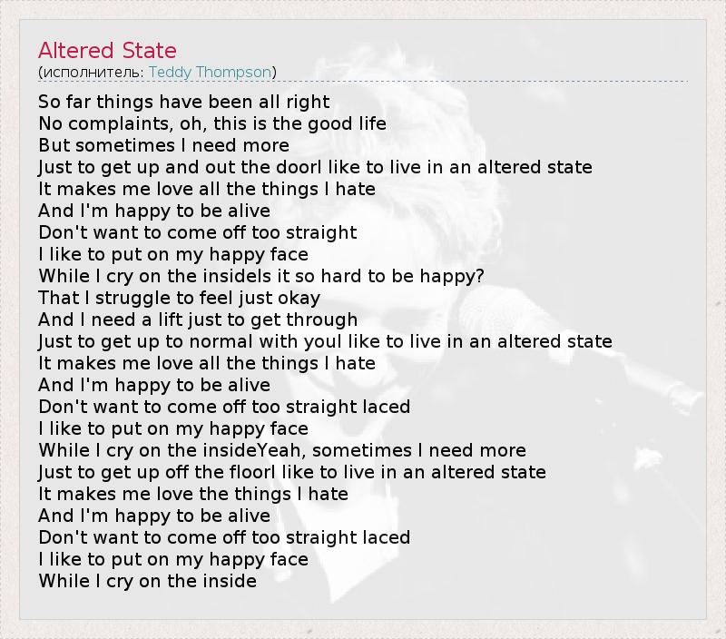So far things have been all right No complaints, oh, this is the good life But sometimes I need more Just to get up and out the doorI like to live in an altered state It makes me love all the things I hate And I'm happy to be alive Don't want to come off too straight I like to put on my happy face While I cry on the insideIs it so hard to be happy? That I struggle to feel just okay And I need a lift just to get through Just to get up to normal with youI like to live in an altered state It makes me love all the things I hate And I'm happy to be alive Don't want to come off too straight laced I like to put on my happy face While I cry on the insideYeah, sometimes I need more Just to get up off the floorI like to live in an altered state It makes me love the things I hate And I'm happy to be alive Don't want to come off too straight laced I like to put on my happy face While I cry on the inside