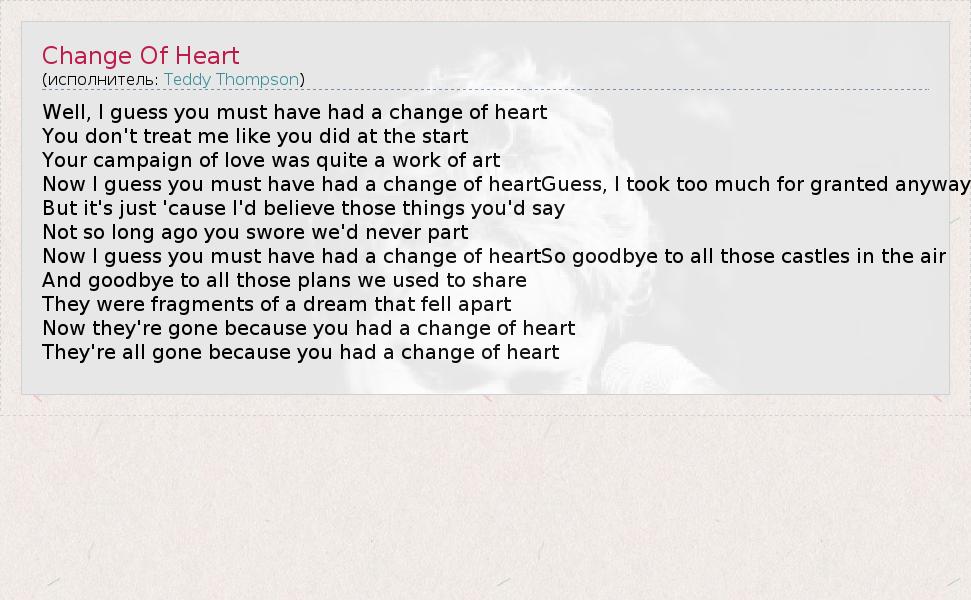 А как ты думаешь, о чем песня "Change Of Heart" ?