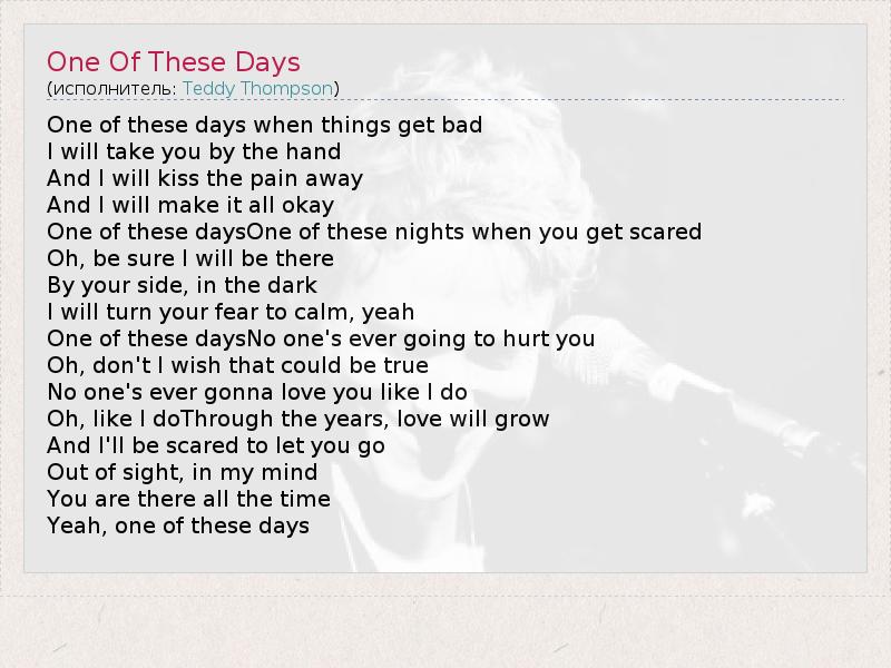 One of these days when things get bad I will take you by the hand And I will kiss the pain away And I will make it all okay One of these daysOne of these nights when you get scared Oh, be sure I will be there By your side, in the dark I will turn your fear to calm, yeah One of these daysNo one's ever going to hurt you Oh, don't I wish that could be true No one's ever gonna love you like I do Oh, like I doThrough the years, love will grow And I'll be scared to let you go Out of sight, in my mind You are there all the time Yeah, one of these days
