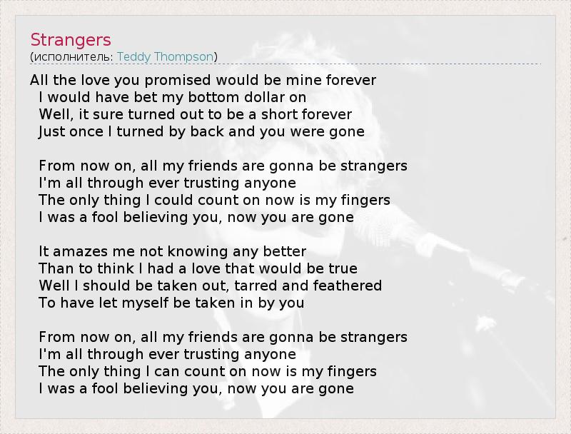 All the love you promised would be mine forever I would have bet my bottom dollar on Well, it sure turned out to be a short forever Just once I turned by back and you were gone From now on, all my friends are gonna be strangers I'm all through ever trusting anyone The only thing I could count on now is my fingers I was a fool believing you, now you are gone It amazes me not knowing any better Than to think I had a love that would be true Well I should be taken out, tarred and feathered To have let myself be taken in by you From now on, all my friends are gonna be strangers I'm all through ever trusting anyone The only thing I can count on now is my fingers I was a fool believing you, now you are gone