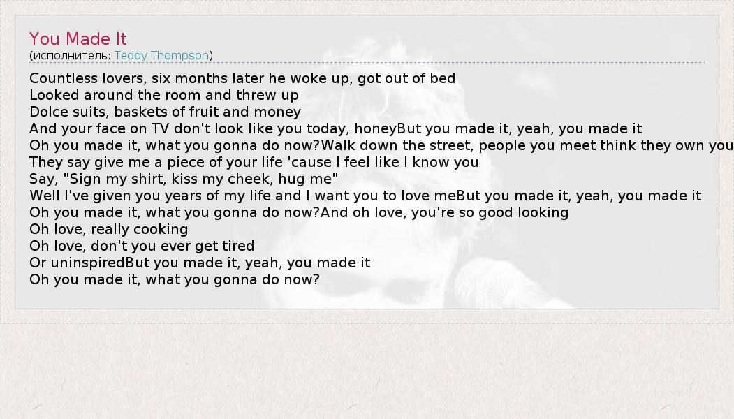 Это интересно:Тедди Томпсон родился в Лондоне в 1976 году, так же он сынЛинды Томпсон и Ричарда Томпсон (Richard & Linda Thompson) его сестра - певица Камила Томпсон.Стиль Тедди очень сложно отнести к какой-либо категории, потому что его музыка находится под различными влияниями. Выросший в окружении Фолк-музыки, он слушал музыкальную гамму таких исполнителей как Hank Williams, Jimi Hendrix, Sam Cooke и госпель(стиль афро-американской... продолжение