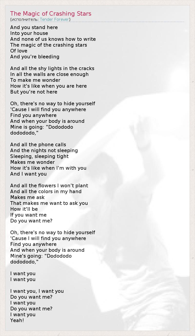 And you stand here Into your house And none of us knows how to write The magic of the crashing stars Of love And you're bleeding And all the shy lights in the cracks In all the walls are close enough To make me wonder How it's like when you are here But you're not here Oh, there's no way to hide yourself 'Cause I will find you anywhere Find you anywhere And when your body is around Mine is going: "Dodododo dodododo," And all the phone calls And the nights not sleeping Sleeping, sleeping tight Makes me wonder How it's like when I'm with you And I want you And all the flowers I won't plant And all the colors in my hand Makes me ask That makes me want to ask you How it'll be If you want me Do you want me? Oh, there's no way to hide yourself 'Cause I will find you anywhere Find you anywhere And when your body is around Mine's going: "Dodododo dodododo," I want you I want you I want you, I want you Do you want me? I want you Do you want me? I want you Yeah!