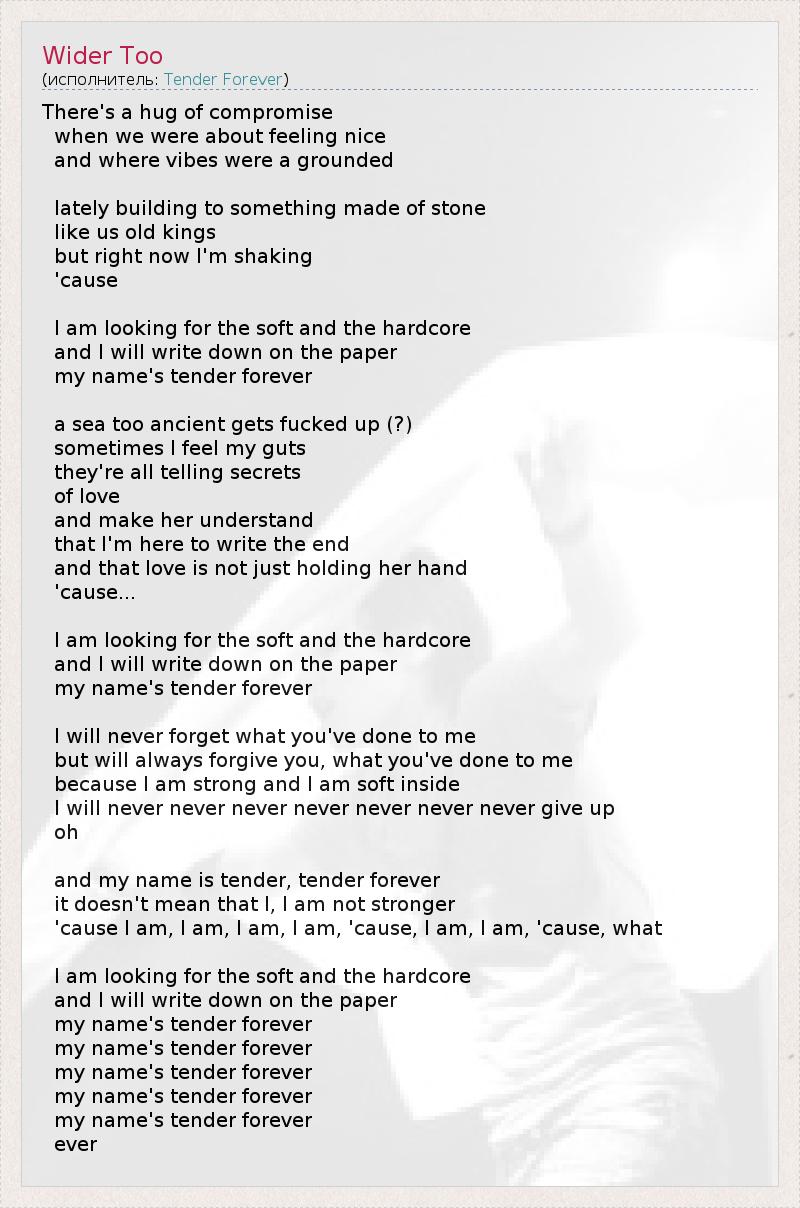 There's a hug of compromise when we were about feeling nice and where vibes were a grounded lately building to something made of stone like us old kings but right now I'm shaking 'cause I am looking for the soft and the hardcore and I will write down on the paper my name's tender forever a sea too ancient gets fucked up (?) sometimes I feel my guts they're all telling secrets of love and make her understand that I'm here to write the end and that love is not just holding her hand 'cause... I am looking for the soft and the hardcore and I will write down on the paper my name's tender forever I will never forget what you've done to me but will always forgive you, what you've done to me because I am strong and I am soft inside I will never never never never never never never give up oh and my name is tender, tender forever it doesn't mean that I, I am not stronger 'cause I am, I am, I am, I am, 'cause, I am, I am, 'cause, what I am looking for the soft and the hardcore and I will write down on the paper my name's tender forever my name's tender forever my name's tender forever my name's tender forever my name's tender forever ever