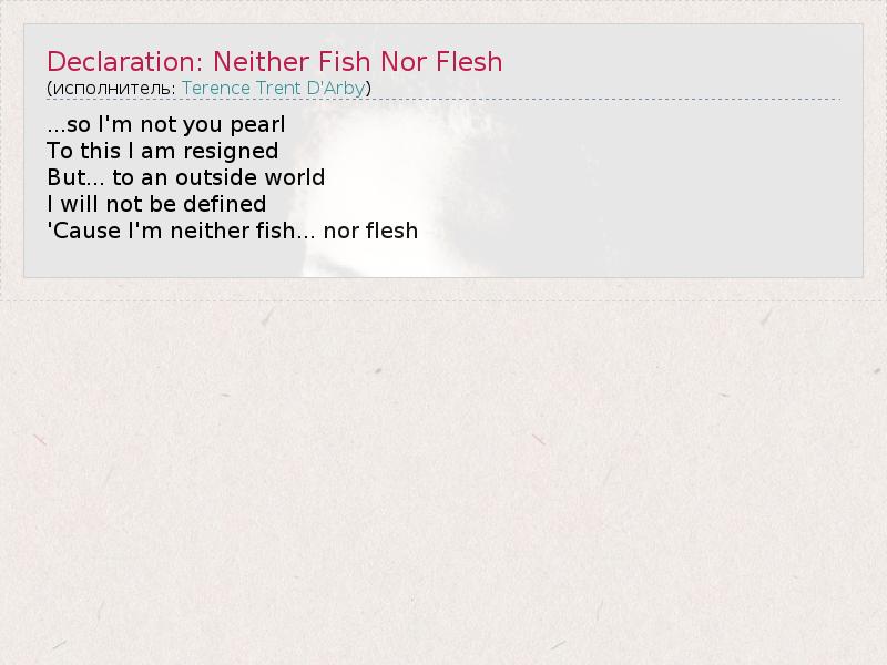 А как ты думаешь, о чем песня "Declaration: Neither Fish Nor Flesh" ?