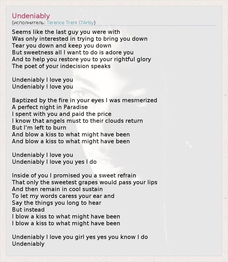 Seems like the last guy you were with Was only interested in trying to bring you down Tear you down and keep you down But sweetness all I want to do is adore you And to help you restore you to your rightful glory The poet of your indecision speaks Undeniably I love you Undeniably I love you Baptized by the fire in your eyes I was mesmerized A perfect night in Paradise I spent with you and paid the price I know that angels must to their clouds return But I'm left to burn And blow a kiss to what might have been And blow a kiss to what might have been Undeniably I love you Undeniably I love you yes I do Inside of you I promised you a sweet refrain That only the sweetest grapes would pass your lips And then remain in cool sustain To let my words caress your ear and Say the things you long to hear But instead I blow a kiss to what might have been I blow a kiss to what might have been Undeniably I love you girl yes yes you know I do Undeniably