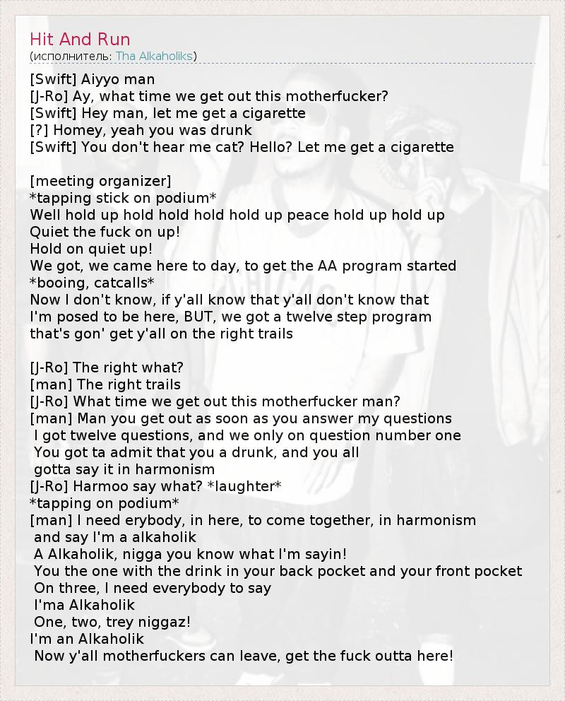 [Swift] Aiyyo man [J-Ro] Ay, what time we get out this motherfucker? [Swift] Hey man, let me get a cigarette [?] Homey, yeah you was drunk [Swift] You don't hear me cat? Hello? Let me get a cigarette [meeting organizer] *tapping stick on podium* Well hold up hold hold hold hold up peace hold up hold up Quiet the fuck on up! Hold on quiet up! We got, we came here to day, to get the AA program started *booing, catcalls* Now I don't know, if y'all know that y'all don't know that I'm posed to be here, BUT, we got a twelve step program that's gon' get y'all on the right trails [J-Ro] The right what? [man] The right trails [J-Ro] What time we get out this motherfucker man? [man] Man you get out as soon as you answer my questions I got twelve questions, and we only on question number one You got ta admit that you a drunk, and you all gotta say it in harmonism [J-Ro] Harmoo say what? *laughter* *tapping on podium* [man] I need erybody, in here, to come together, in harmonism and say I'm a alkaholik A Alkaholik, nigga you know what I'm sayin! You the one with the drink in your back pocket and your front pocket On three, I need everybody to say I'ma Alkaholik One, two, trey niggaz! I'm an Alkaholik Now y'all motherfuckers can leave, get the fuck outta here!