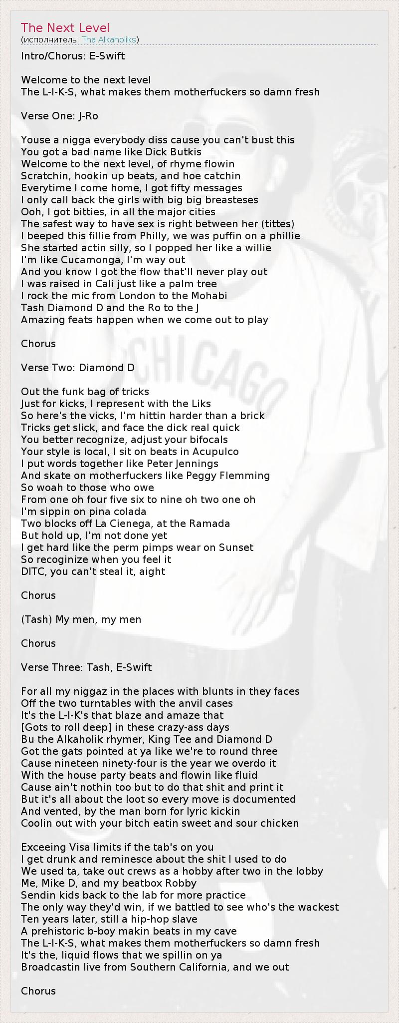 Intro/Chorus: E-Swift Welcome to the next level The L-I-K-S, what makes them motherfuckers so damn fresh Verse One: J-Ro Youse a nigga everybody diss cause you can't bust this You got a bad name like Dick Butkis Welcome to the next level, of rhyme flowin Scratchin, hookin up beats, and hoe catchin Everytime I come home, I got fifty messages I only call back the girls with big big breasteses Ooh, I got bitties, in all the major cities The safest way to have sex is right between her (tittes) I beeped this fillie from Philly, we was puffin on a phillie She started actin silly, so I popped her like a willie I'm like Cucamonga, I'm way out And you know I got the flow that'll never play out I was raised in Cali just like a palm tree I rock the mic from London to the Mohabi Tash Diamond D and the Ro to the J Amazing feats happen when we come out to play Chorus Verse Two: Diamond D Out the funk bag of tricks Just for kicks, I represent with the Liks So here's the vicks, I'm hittin harder than a brick Tricks get slick, and face the dick real quick You better recognize, adjust your bifocals Your style is local, I sit on beats in Acupulco I put words together like Peter Jennings And skate on motherfuckers like Peggy Flemming So woah to those who owe From one oh four five six to nine oh two one oh I'm sippin on pina colada Two blocks off La Cienega, at the Ramada But hold up, I'm not done yet I get hard like the perm pimps wear on Sunset So recoginize when you feel it DITC, you can't steal it, aight Chorus (Tash) My men, my men Chorus Verse Three: Tash, E-Swift For all my niggaz in the places with blunts in they faces Off the two turntables with the anvil cases It's the L-I-K's that blaze and amaze that [Gots to roll deep] in these crazy-ass days Bu the Alkaholik rhymer, King Tee and Diamond D Got the gats pointed at ya like we're to round three Cause nineteen ninety-four is the year we overdo it With the house party beats and flowin like fluid Cause ain't nothin too but to do that shit and print it But it's all about the loot so every move is documented And vented, by the man born for lyric kickin Coolin out with your bitch eatin sweet and sour chicken Exceeing Visa limits if the tab's on you I get drunk and reminesce about the shit I used to do We used ta, take out crews as a hobby after two in the lobby Me, Mike D, and my beatbox Robby Sendin kids back to the lab for more practice The only way they'd win, if we battled to see who's the wackest Ten years later, still a hip-hop slave A prehistoric b-boy makin beats in my cave The L-I-K-S, what makes them motherfuckers so damn fresh It's the, liquid flows that we spillin on ya Broadcastin live from Southern California, and we out Chorus