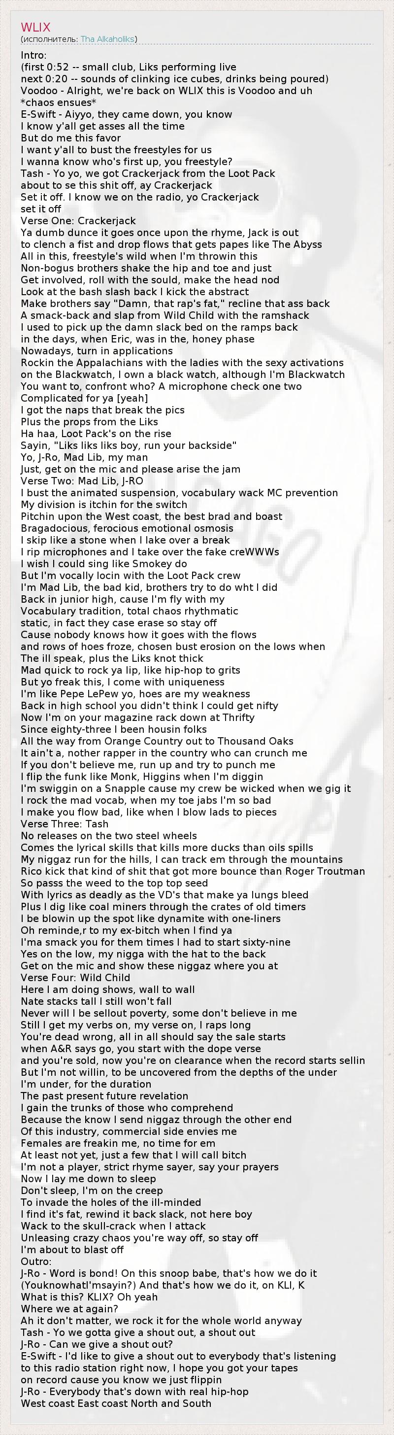 Intro: (first 0:52 -- small club, Liks performing live next 0:20 -- sounds of clinking ice cubes, drinks being poured) Voodoo - Alright, we're back on WLIX this is Voodoo and uh *chaos ensues* E-Swift - Aiyyo, they came down, you know I know y'all get asses all the time But do me this favor I want y'all to bust the freestyles for us I wanna know who's first up, you freestyle? Tash - Yo yo, we got Crackerjack from the Loot Pack about to se this shit off, ay Crackerjack Set it off. I know we on the radio, yo Crackerjack set it off Verse One: Crackerjack Ya dumb dunce it goes once upon the rhyme, Jack is out to clench a fist and drop flows that gets papes like The Abyss All in this, freestyle's wild when I'm throwin this Non-bogus brothers shake the hip and toe and just Get involved, roll with the sould, make the head nod Look at the bash slash back I kick the abstract Make brothers say "Damn, that rap's fat," recline that ass back A smack-back and slap from Wild Child with the ramshack I used to pick up the damn slack bed on the ramps back in the days, when Eric, was in the, honey phase Nowadays, turn in applications Rockin the Appalachians with the ladies with the sexy activations on the Blackwatch, I own a black watch, although I'm Blackwatch You want to, confront who? A microphone check one two Complicated for ya [yeah] I got the naps that break the pics Plus the props from the Liks Ha haa, Loot Pack's on the rise Sayin, "Liks liks liks boy, run your backside" Yo, J-Ro, Mad Lib, my man Just, get on the mic and please arise the jam Verse Two: Mad Lib, J-RO I bust the animated suspension, vocabulary wack MC prevention My division is itchin for the switch Pitchin upon the West coast, the best brad and boast Bragadocious, ferocious emotional osmosis I skip like a stone when I lake over a break I rip microphones and I take over the fake creWWWs I wish I could sing like Smokey do But I'm vocally locin with the Loot Pack crew I'm Mad Lib, the bad kid, brothers try to do wht I did Back in junior high, cause I'm fly with my Vocabulary tradition, total chaos rhythmatic static, in fact they case erase so stay off Cause nobody knows how it goes with the flows and rows of hoes froze, chosen bust erosion on the lows when The ill speak, plus the Liks knot thick Mad quick to rock ya lip, like hip-hop to grits But yo freak this, I come with uniqueness I'm like Pepe LePew yo, hoes are my weakness Back in high school you didn't think I could get nifty Now I'm on your magazine rack down at Thrifty Since eighty-three I been housin folks All the way from Orange Country out to Thousand Oaks It ain't a, nother rapper in the country who can crunch me If you don't believe me, run up and try to punch me I flip the funk like Monk, Higgins when I'm diggin I'm swiggin on a Snapple cause my crew be wicked when we gig it I rock the mad vocab, when my toe jabs I'm so bad I make you flow bad, like when I blow lads to pieces Verse Three: Tash No releases on the two steel wheels Comes the lyrical skills that kills more ducks than oils spills My niggaz run for the hills, I can track em through the mountains Rico kick that kind of shit that got more bounce than Roger Troutman So passs the weed to the top top seed With lyrics as deadly as the VD's that make ya lungs bleed Plus I dig like coal miners through the crates of old timers I be blowin up the spot like dynamite with one-liners Oh reminde,r to my ex-bitch when I find ya I'ma smack you for them times I had to start sixty-nine Yes on the low, my nigga with the hat to the back Get on the mic and show these niggaz where you at Verse Four: Wild Child Here I am doing shows, wall to wall Nate stacks tall I still won't fall Never will I be sellout poverty, some don't believe in me Still I get my verbs on, my verse on, I raps long You're dead wrong, all in all should say the sale starts when A&R says go, you start with the dope verse and you're sold, now you're on clearance when the record starts sellin But I'm not willin, to be uncovered from the depths of the under I'm under, for the duration The past present future revelation I gain the trunks of those who comprehend Because the know I send niggaz through the other end Of this industry, commercial side envies me Females are freakin me, no time for em At least not yet, just a few that I will call bitch I'm not a player, strict rhyme sayer, say your prayers Now I lay me down to sleep Don't sleep, I'm on the creep To invade the holes of the ill-minded I find it's fat, rewind it back slack, not here boy Wack to the skull-crack when I attack Unleasing crazy chaos you're way off, so stay off I'm about to blast off Outro: J-Ro - Word is bond! On this snoop babe, that's how we do it (YouknowhatI'msayin?) And that's how we do it, on KLI, K What is this? KLIX? Oh yeah Where we at again? Ah it don't matter, we rock it for the whole world anyway Tash - Yo we gotta give a shout out, a shout out J-Ro - Can we give a shout out? E-Swift - I'd like to give a shout out to everybody that's listening to this radio station right now, I hope you got your tapes on record cause you know we just flippin J-Ro - Everybody that's down with real hip-hop West coast East coast North and South