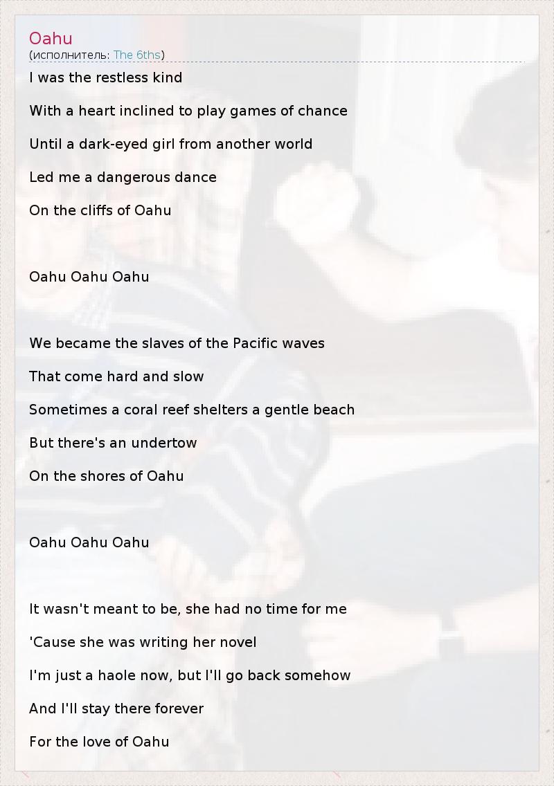 I was the restless kind With a heart inclined to play games of chance Until a dark-eyed girl from another world Led me a dangerous dance On the cliffs of Oahu Oahu Oahu Oahu We became the slaves of the Pacific waves That come hard and slow Sometimes a coral reef shelters a gentle beach But there's an undertow On the shores of Oahu Oahu Oahu Oahu It wasn't meant to be, she had no time for me 'Cause she was writing her novel I'm just a haole now, but I'll go back somehow And I'll stay there forever For the love of Oahu
